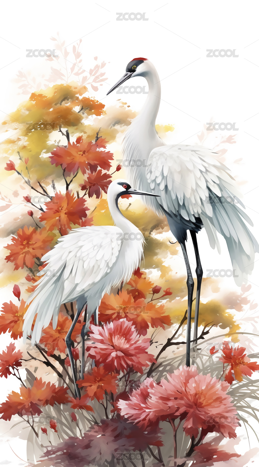白鹤飞舞菊花从中