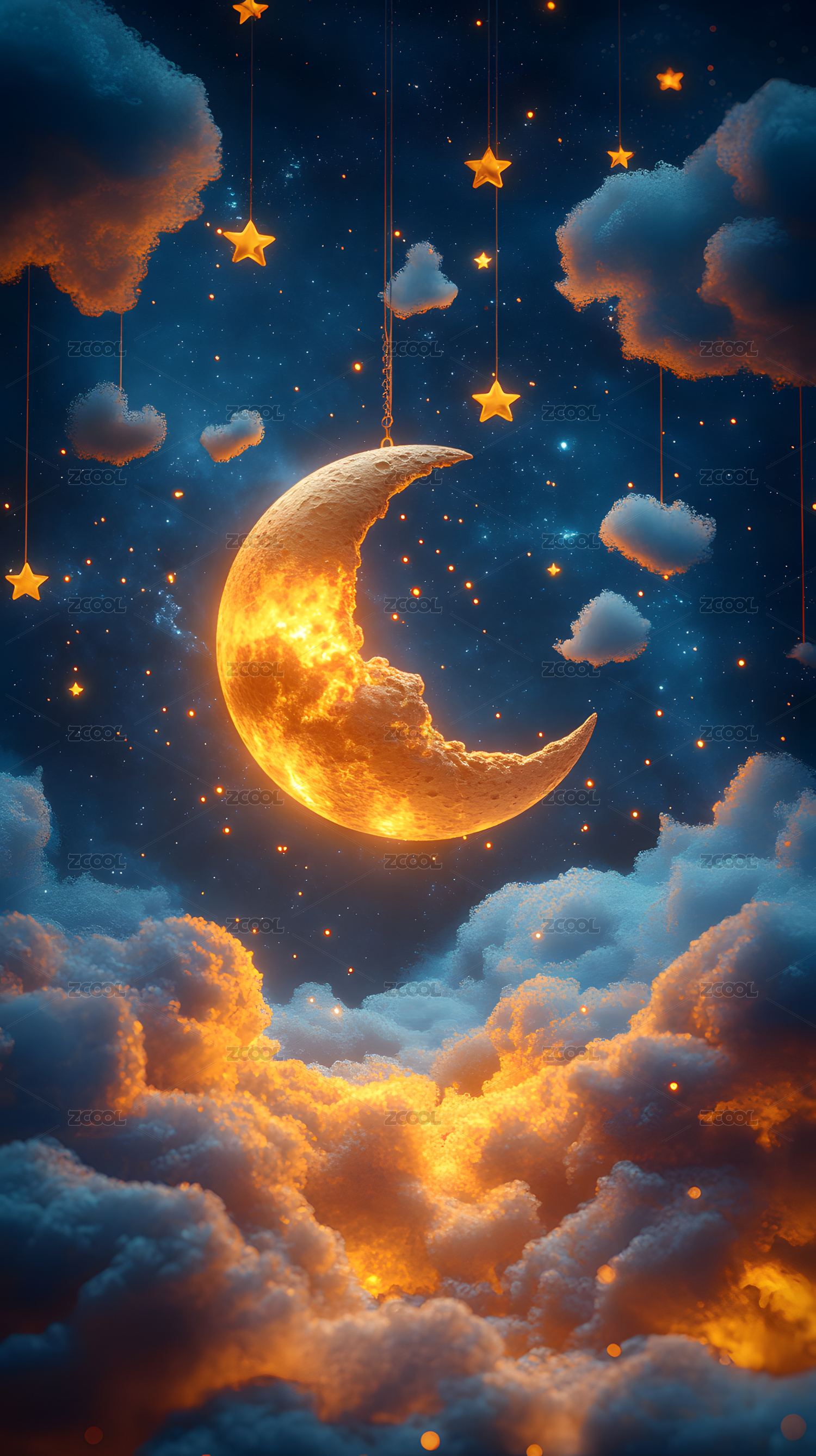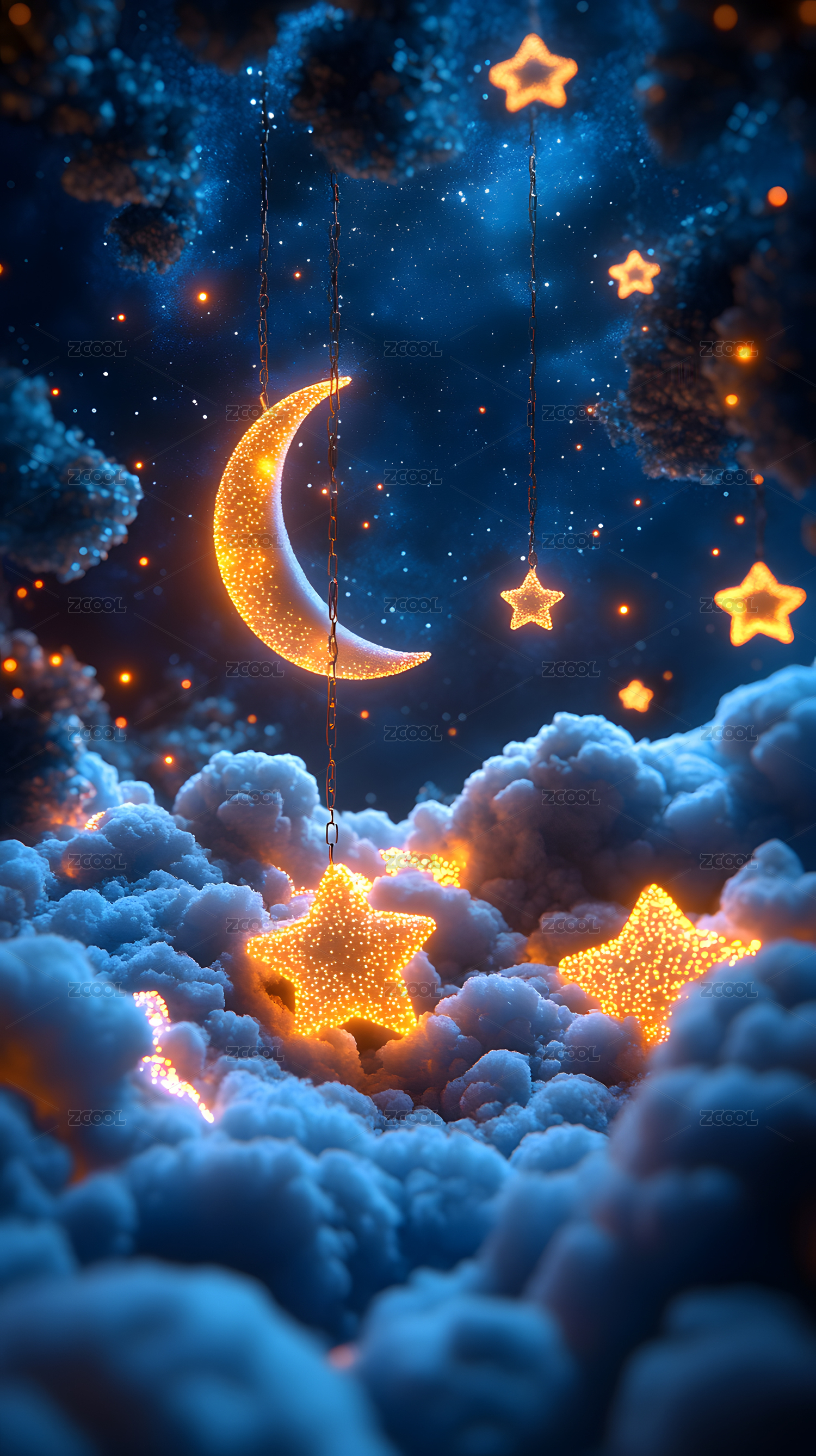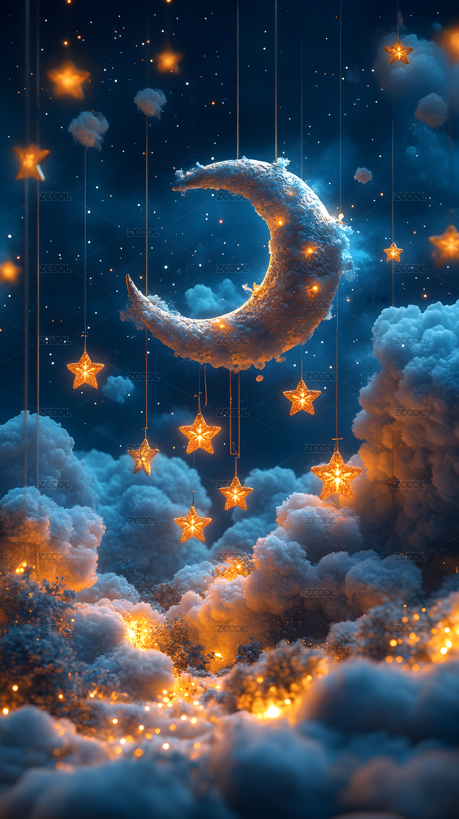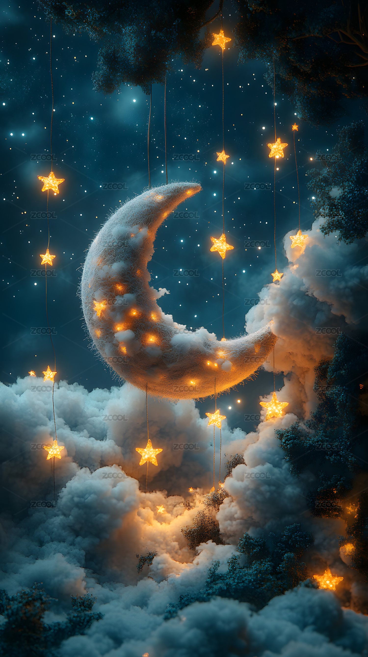 夜晚可爱羊毛毡毛绒星空3D卡通立体插画