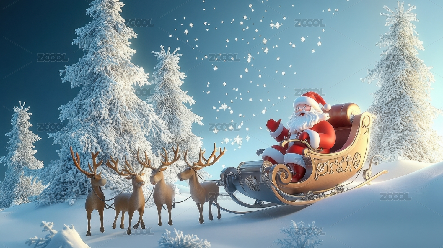 3D卡通插画驯鹿拉着圣诞老人送礼物
