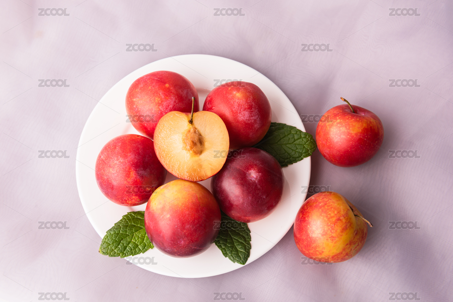 白底上放着一盘红李子