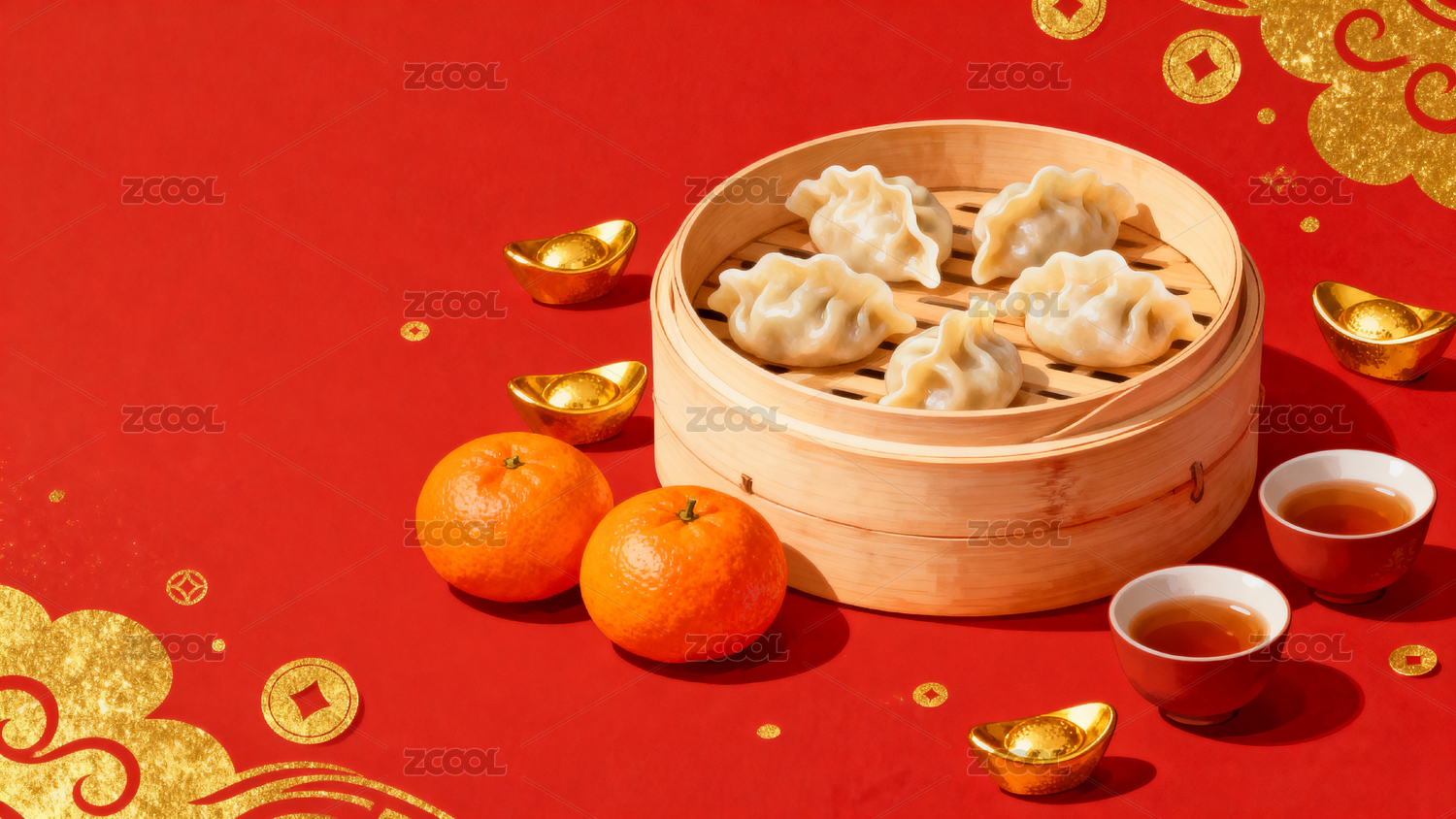 传统中式早点包子馒头放在蒸笼里和茶俯拍