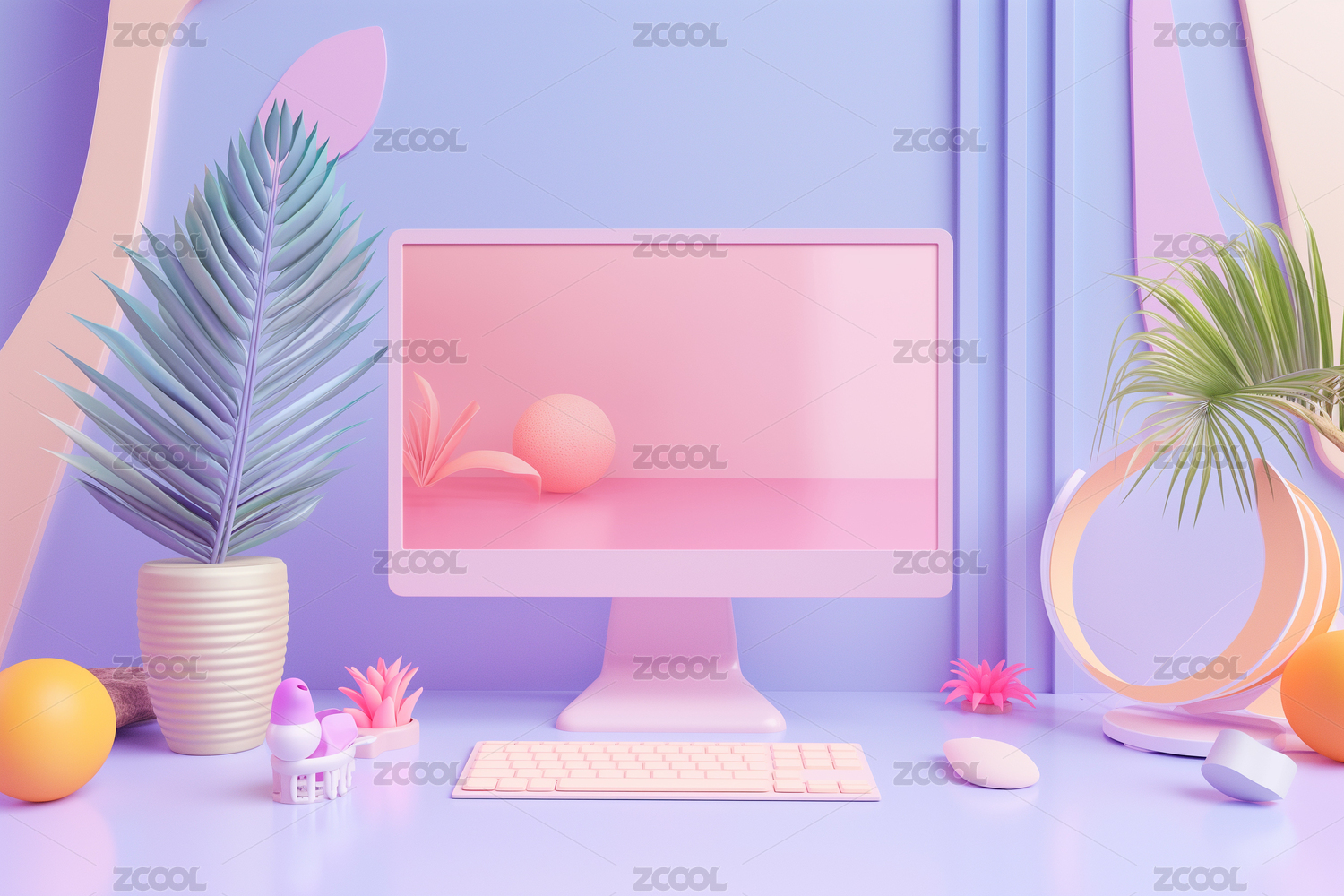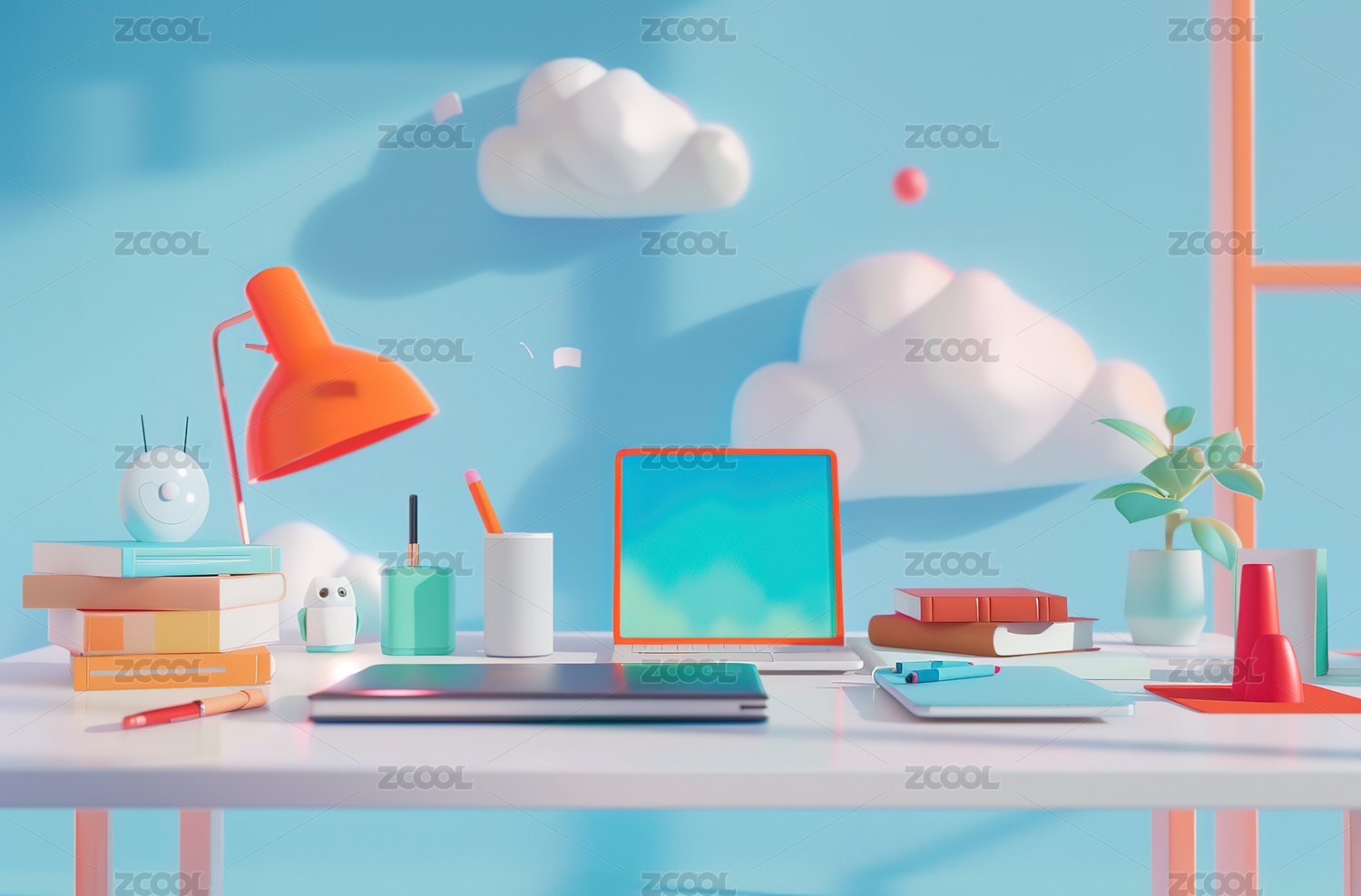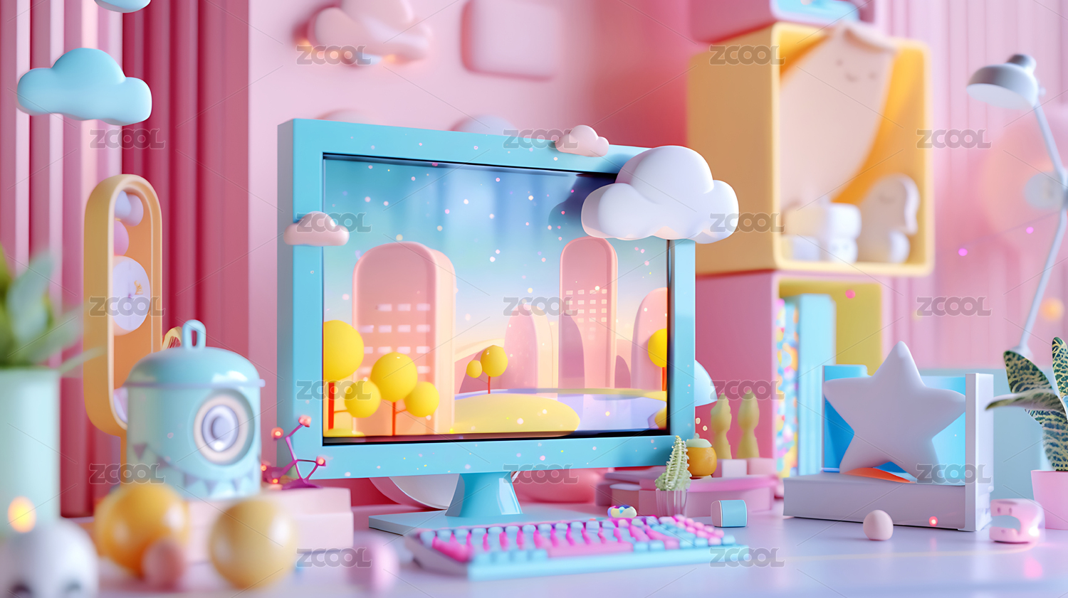 马卡龙色系电脑书桌3D场景渲染背景