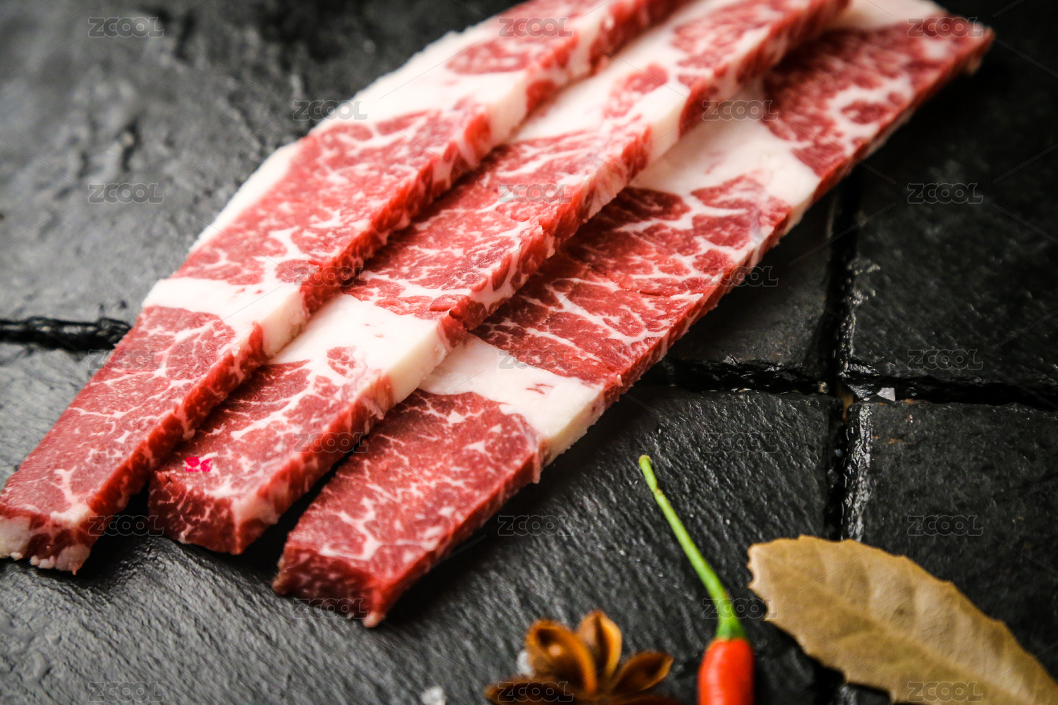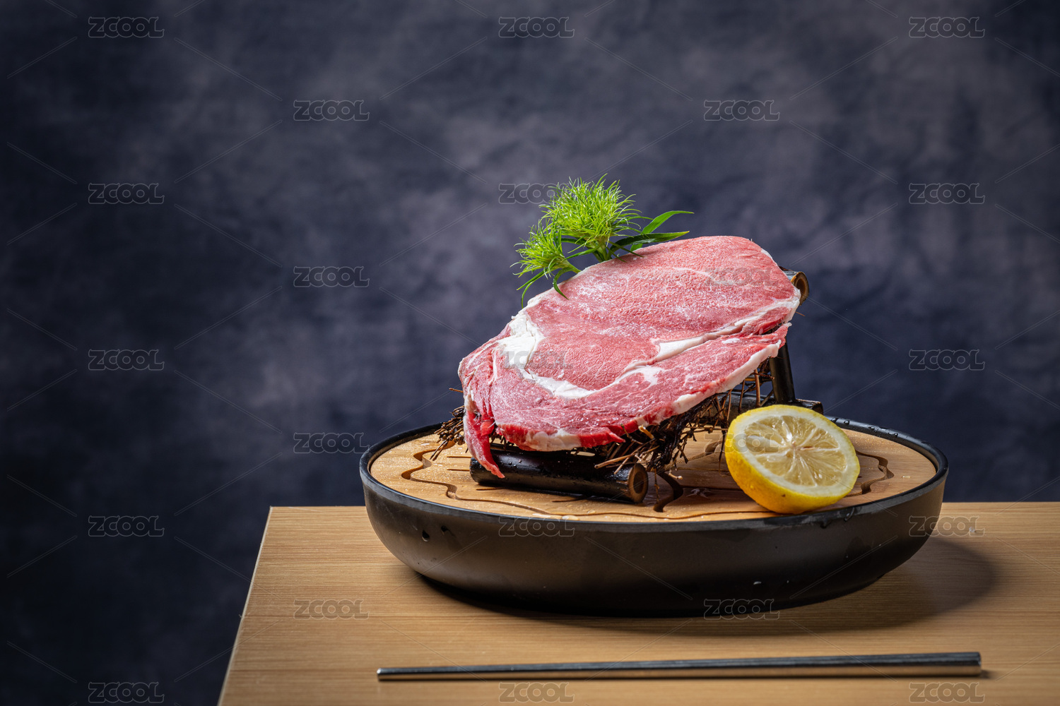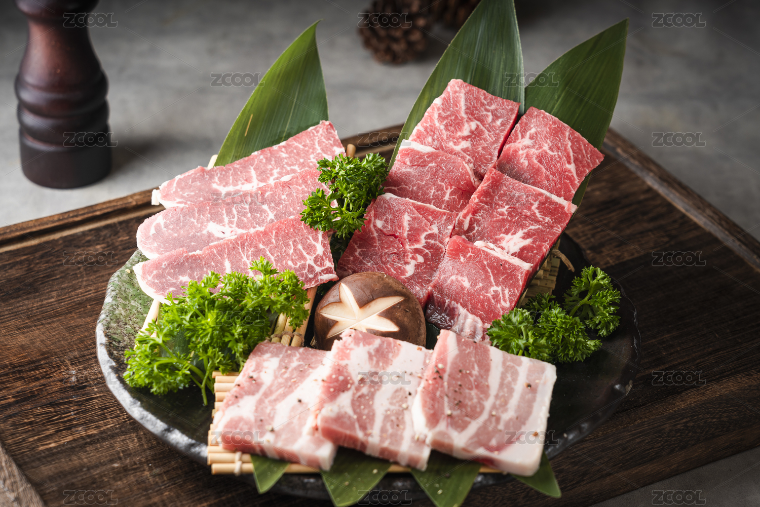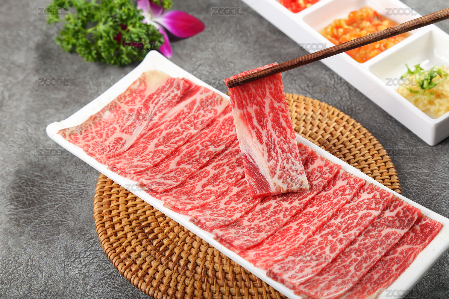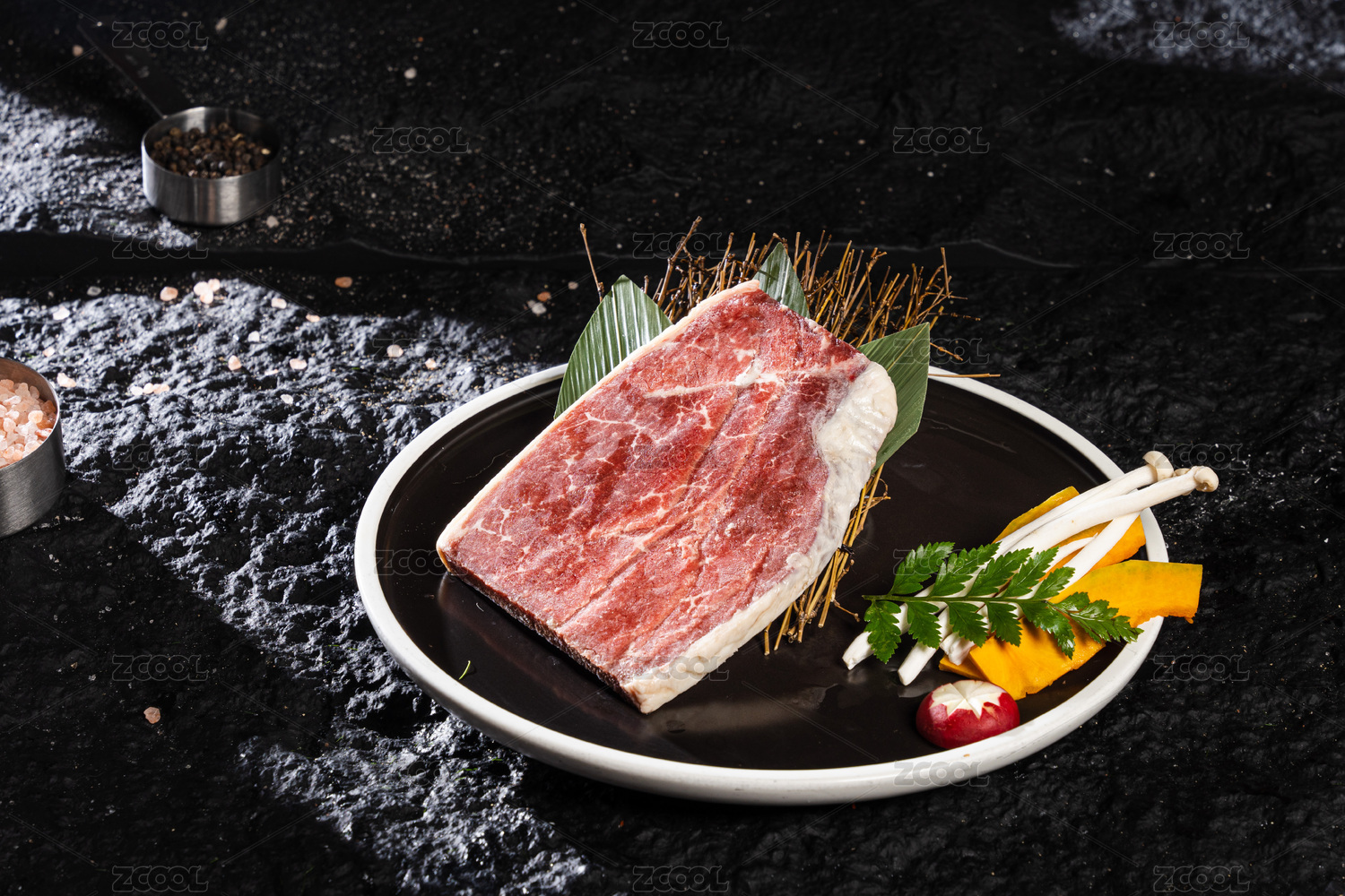 日式盘子里的烧烤烤肉日餐料理食材雪花牛肉
