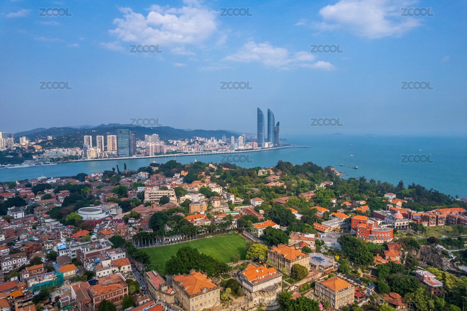 中国福建厦门双子塔和鼓浪屿晴天风光