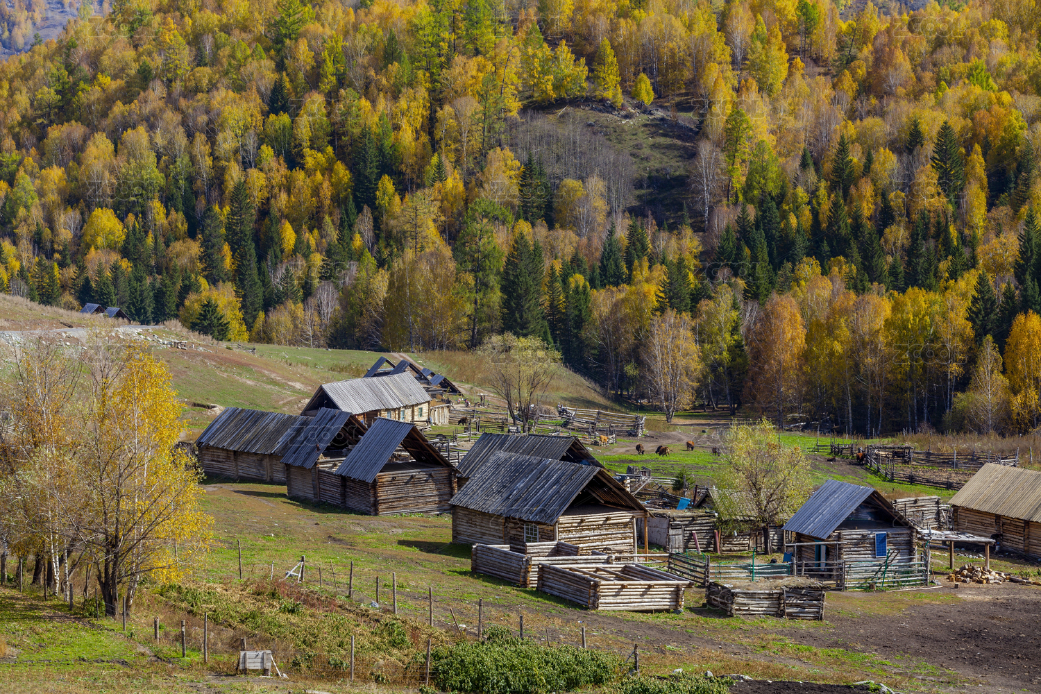 中国新疆喀纳斯原生态乡村小木屋秋色风光