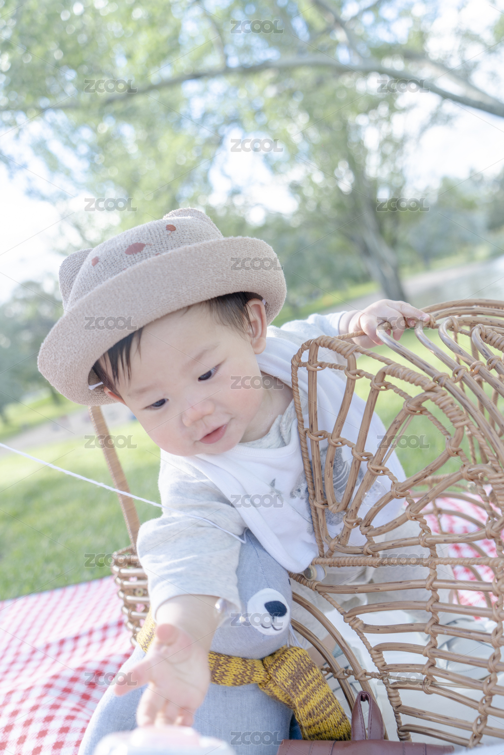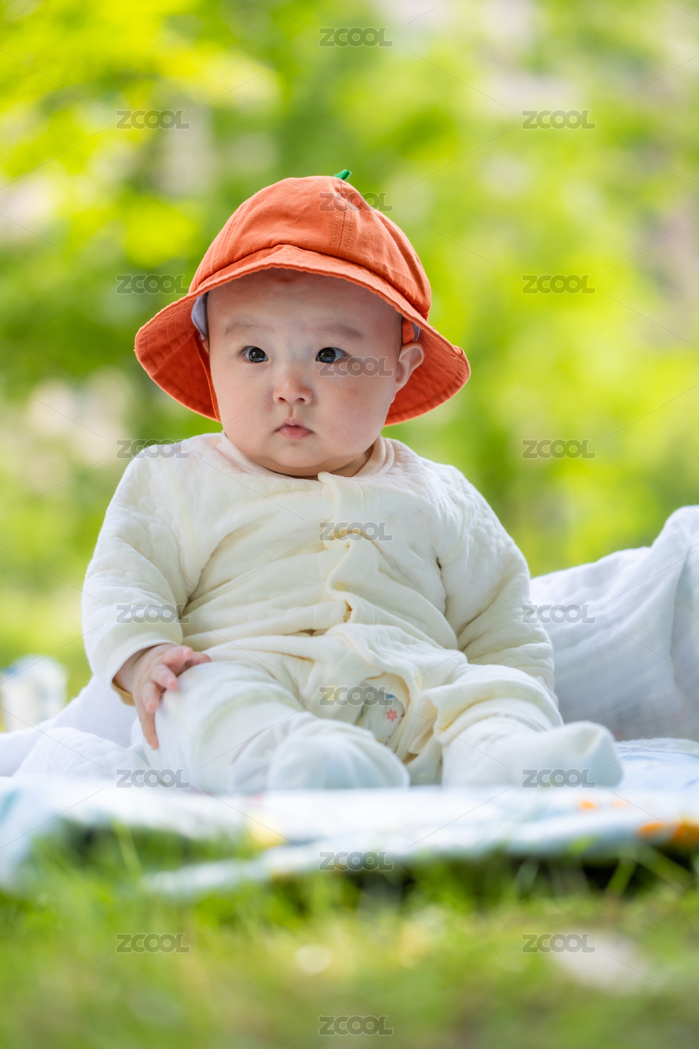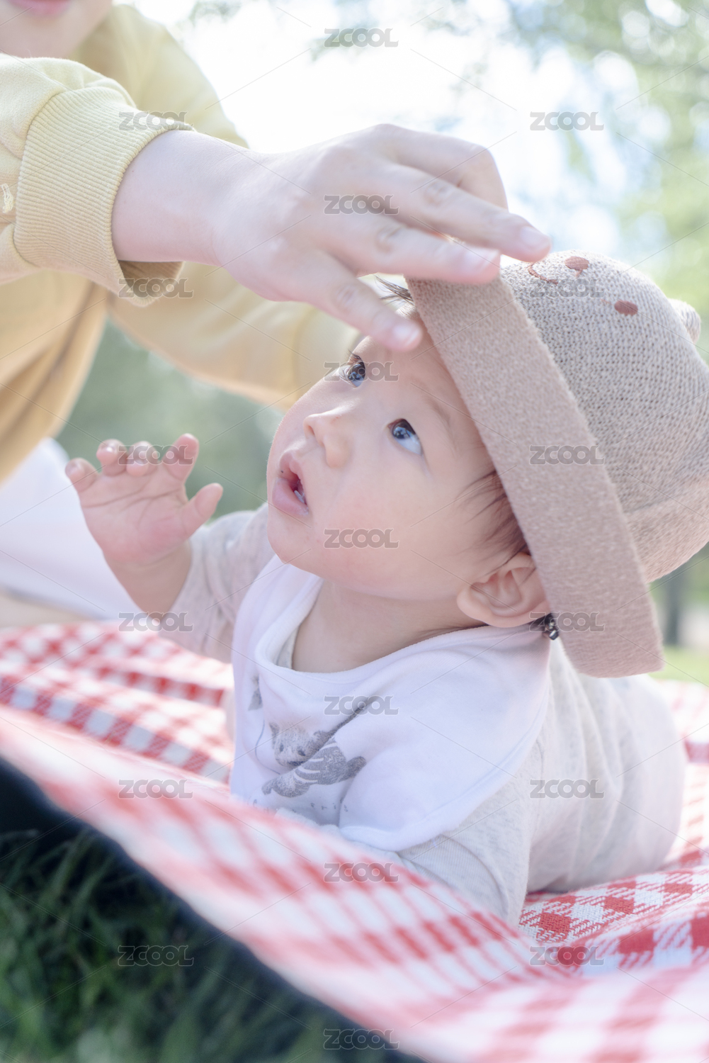 戴着遮阳帽的男婴坐在野餐垫上晒太阳