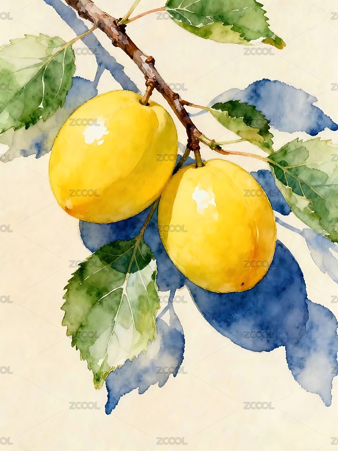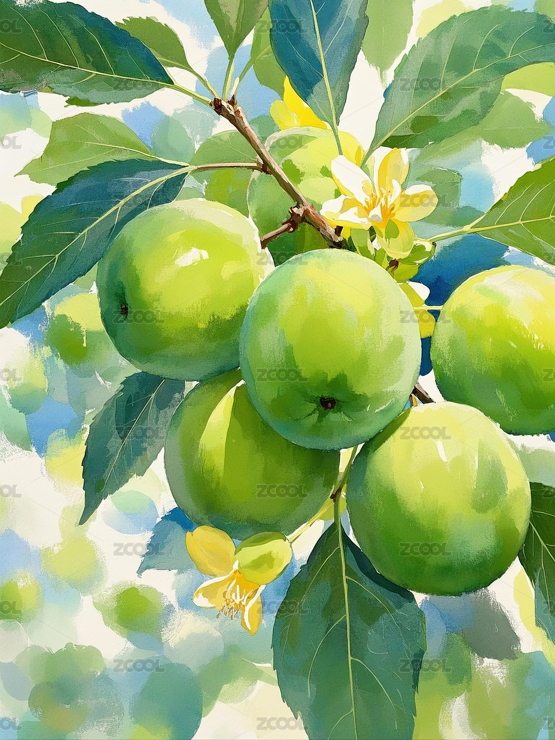 水果,叶子,树枝,绘画,艺术,自然,植物,鲜艳,光影,细节