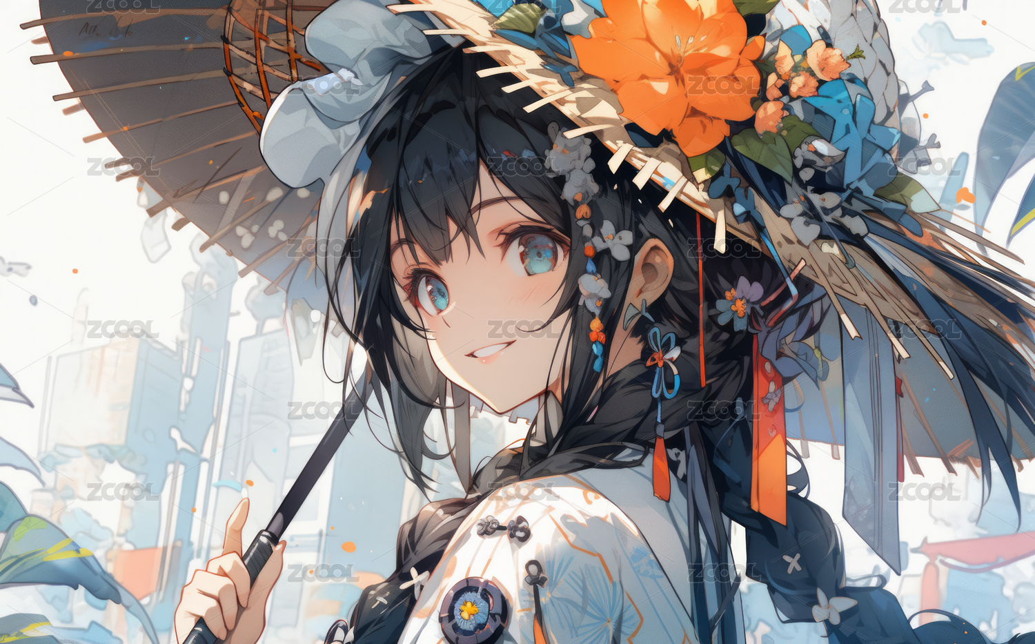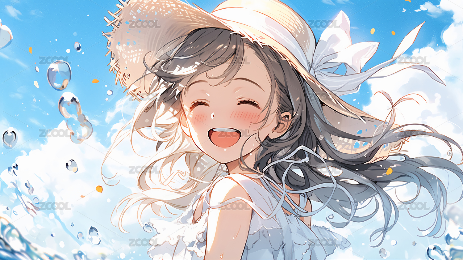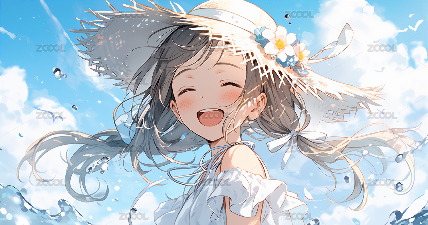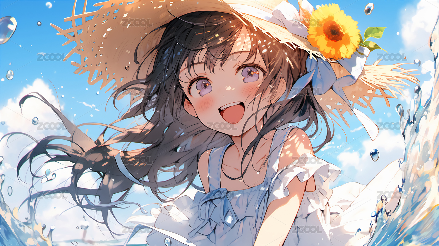 女孩,二次元,少女,清新,海滩,海鸥,海岸,草帽