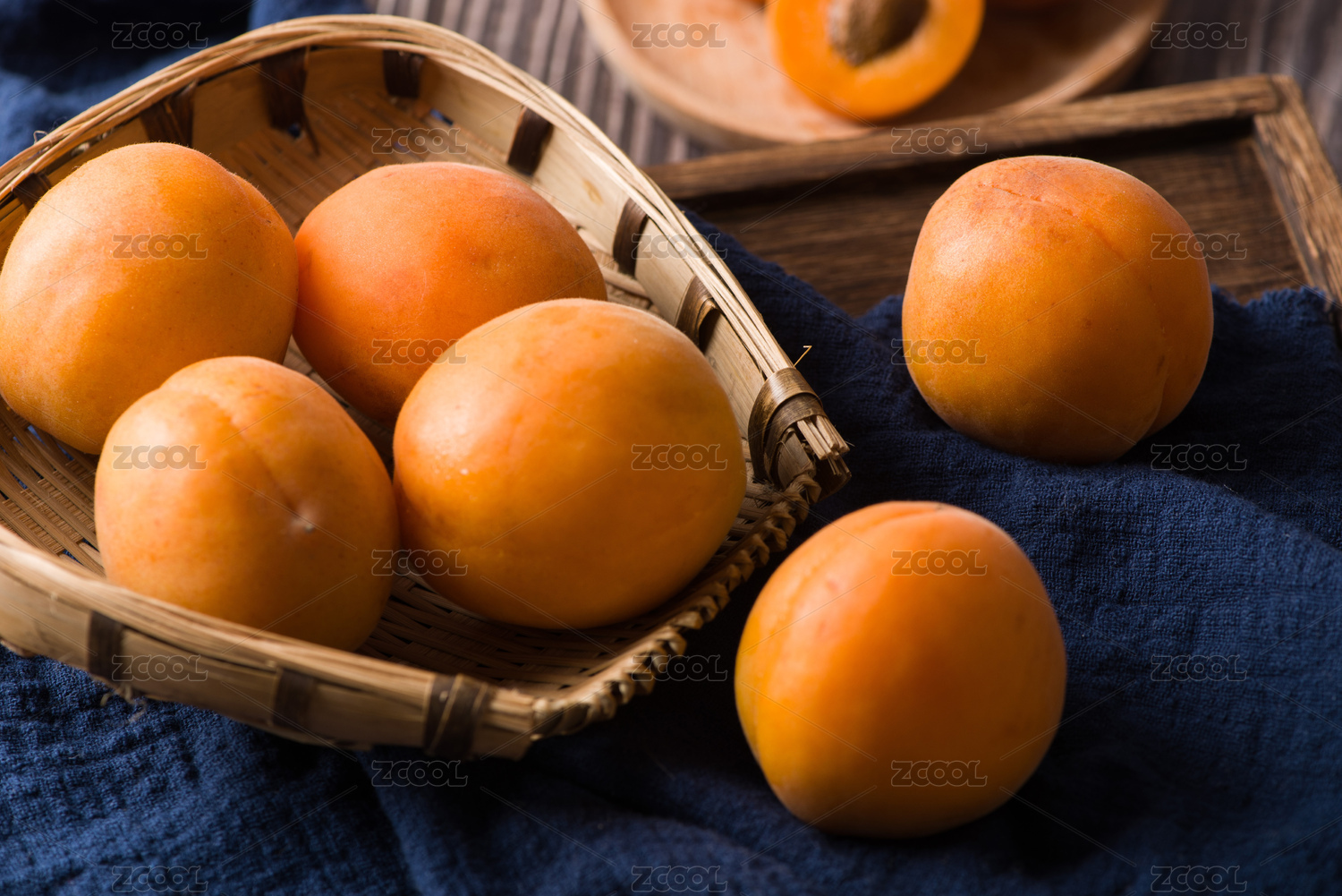 竹碟里成熟的橘黄色的杏子