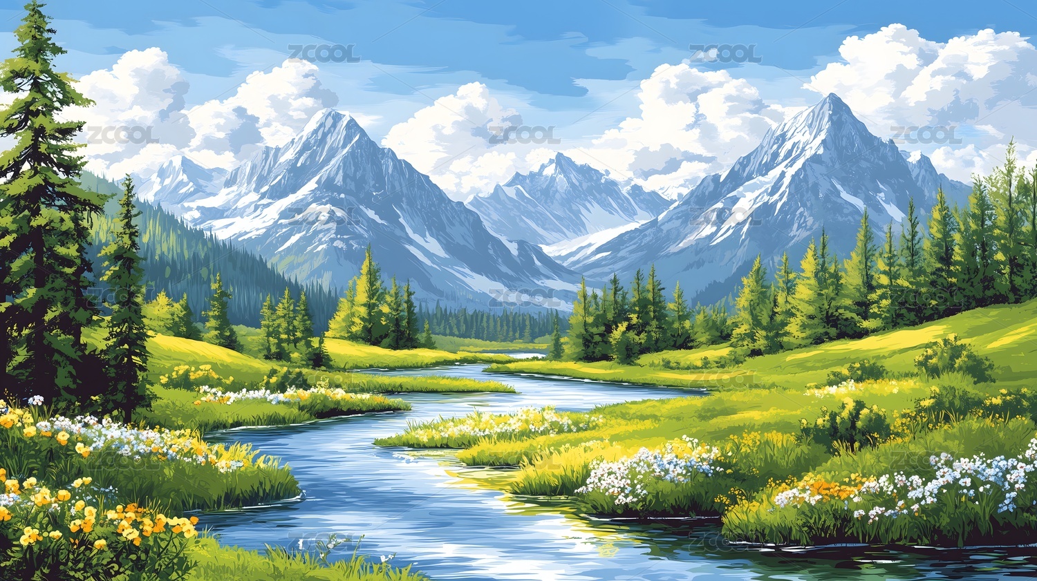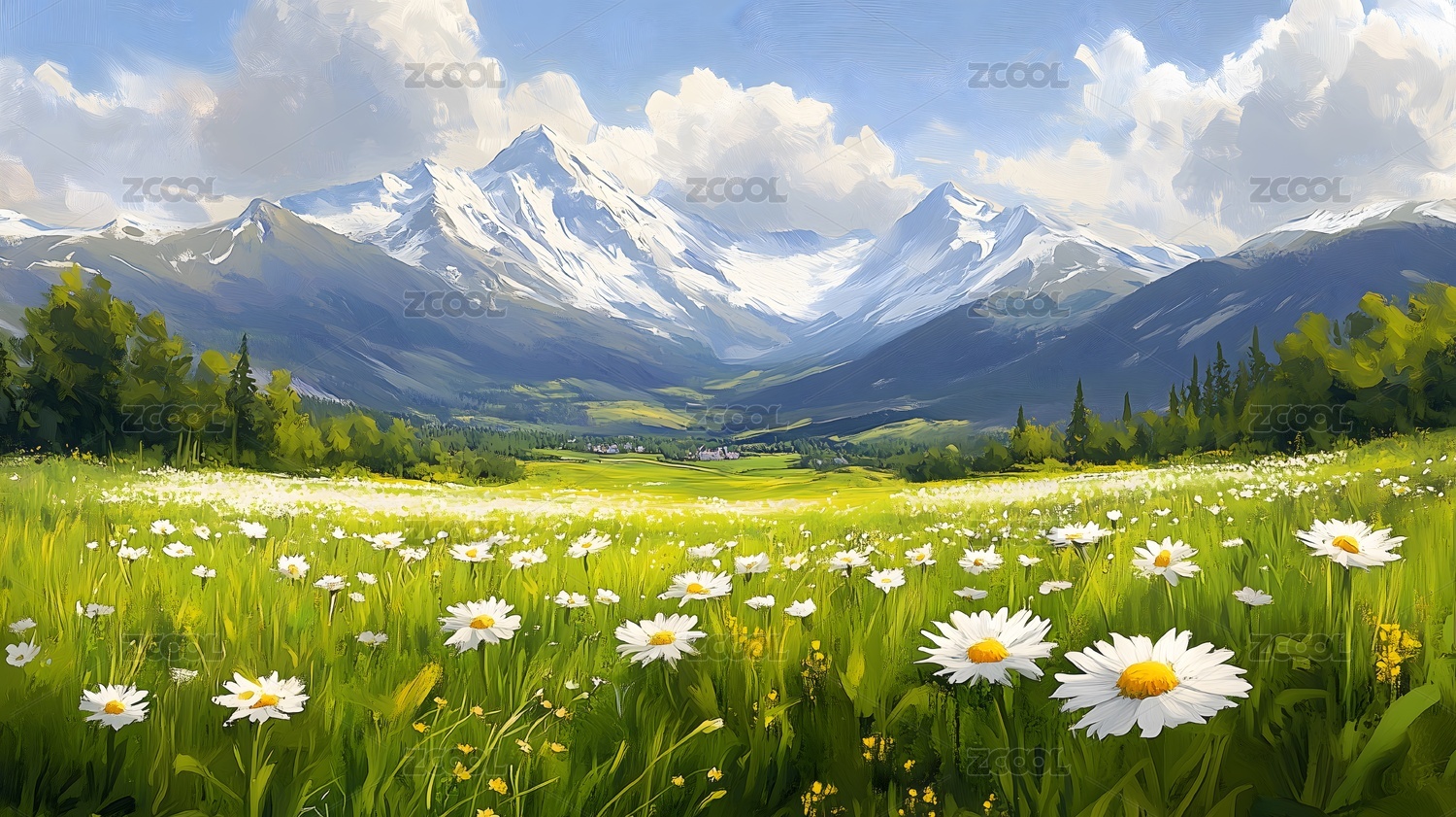 雪山草甸的油画风光