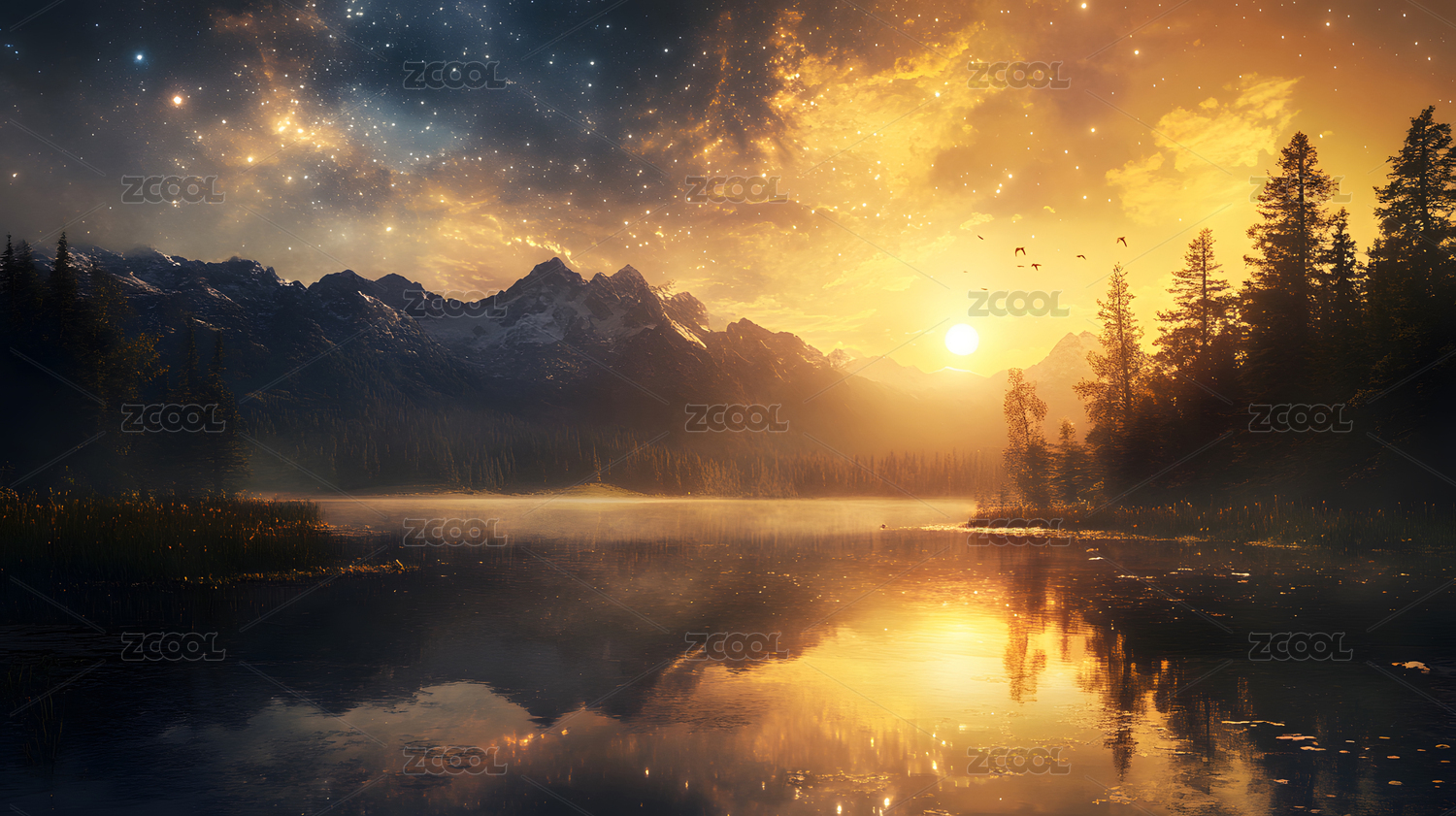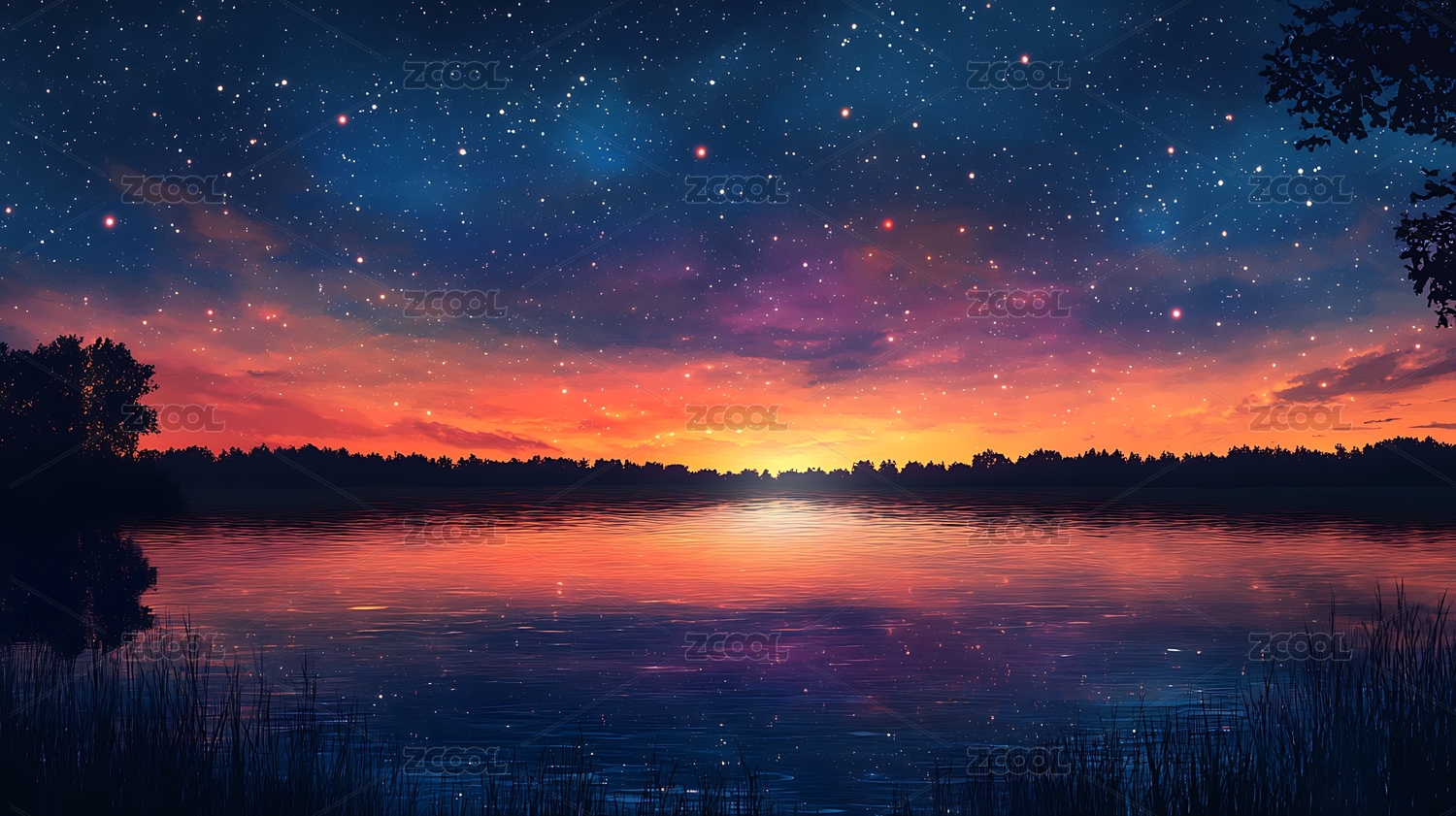 森林,湖面,极光,倒影,自然,绚丽,风景,天空,红色,橙色