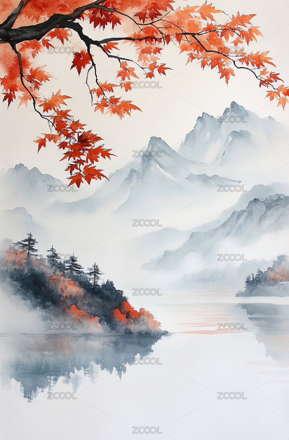 秋景,树林,小路,落叶,枫叶,金色,橙色,红色,水彩画,风景画