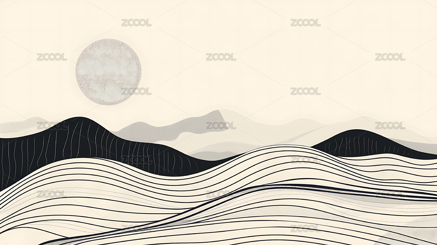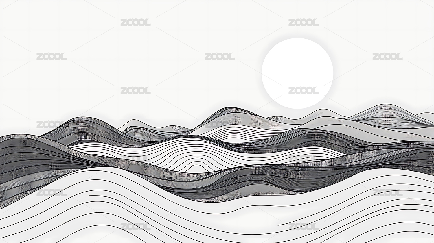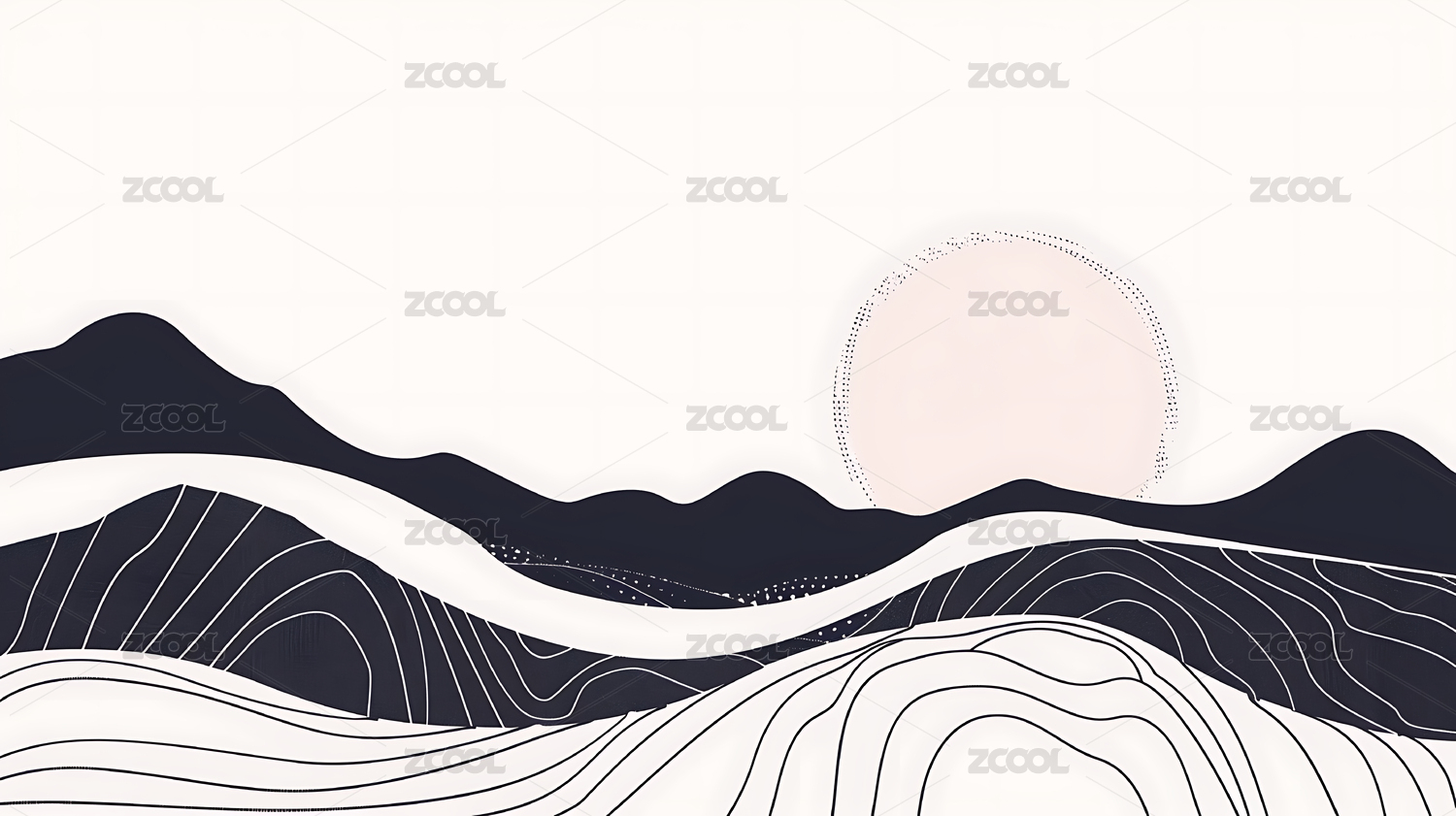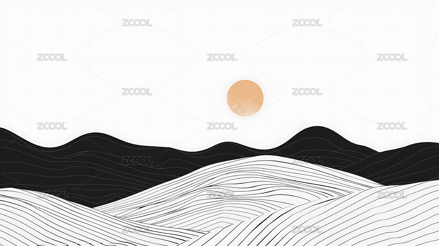 黑色背景太阳与群山线条设计