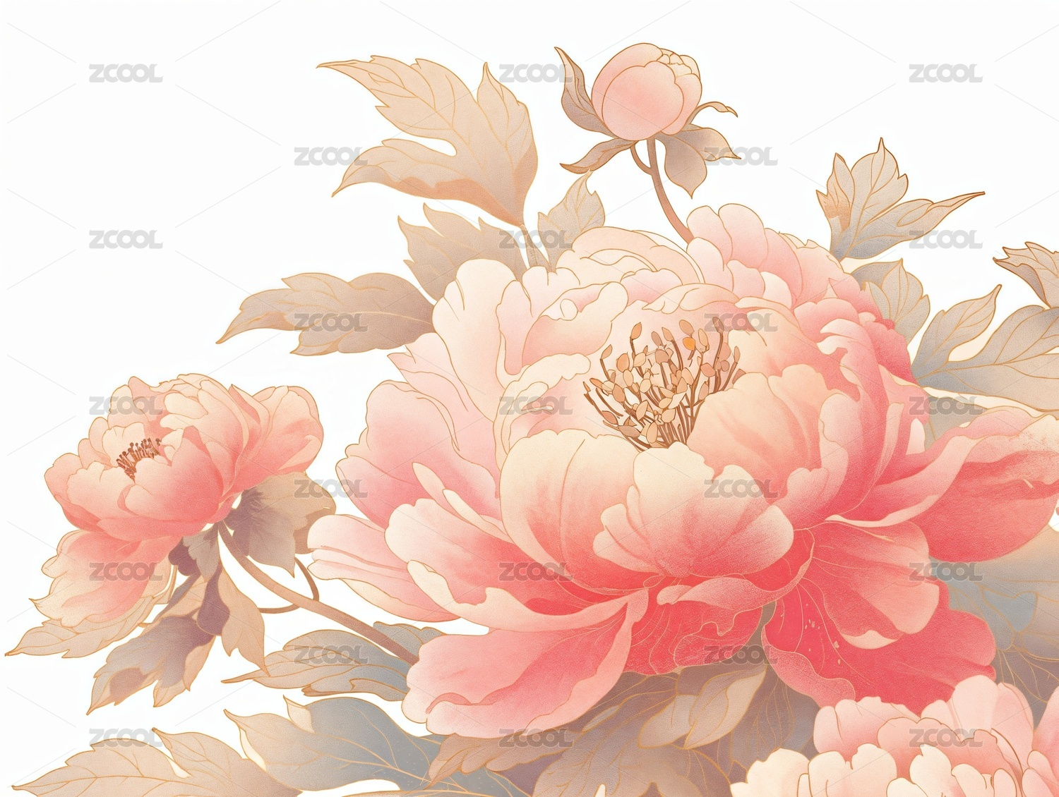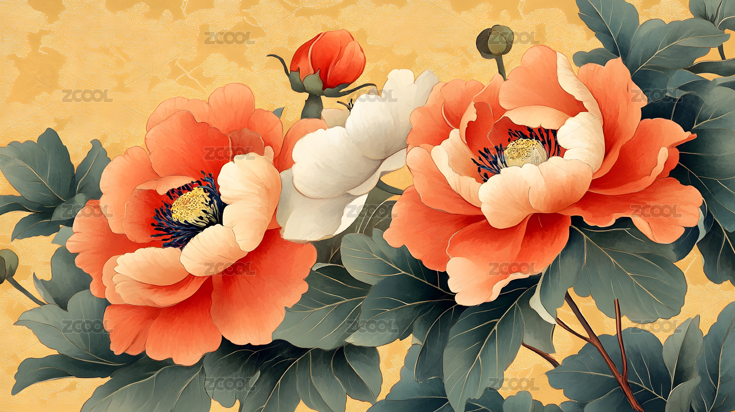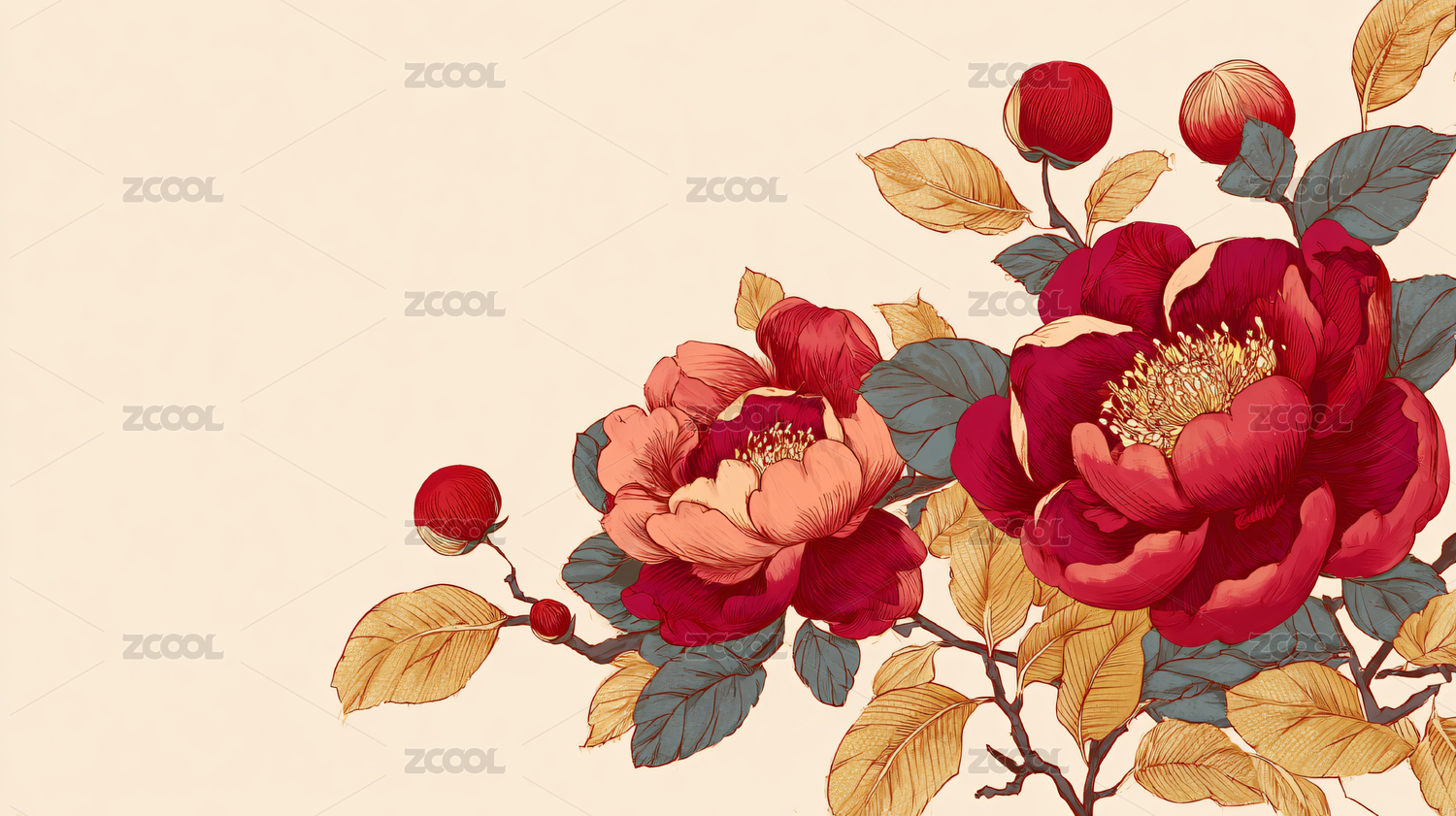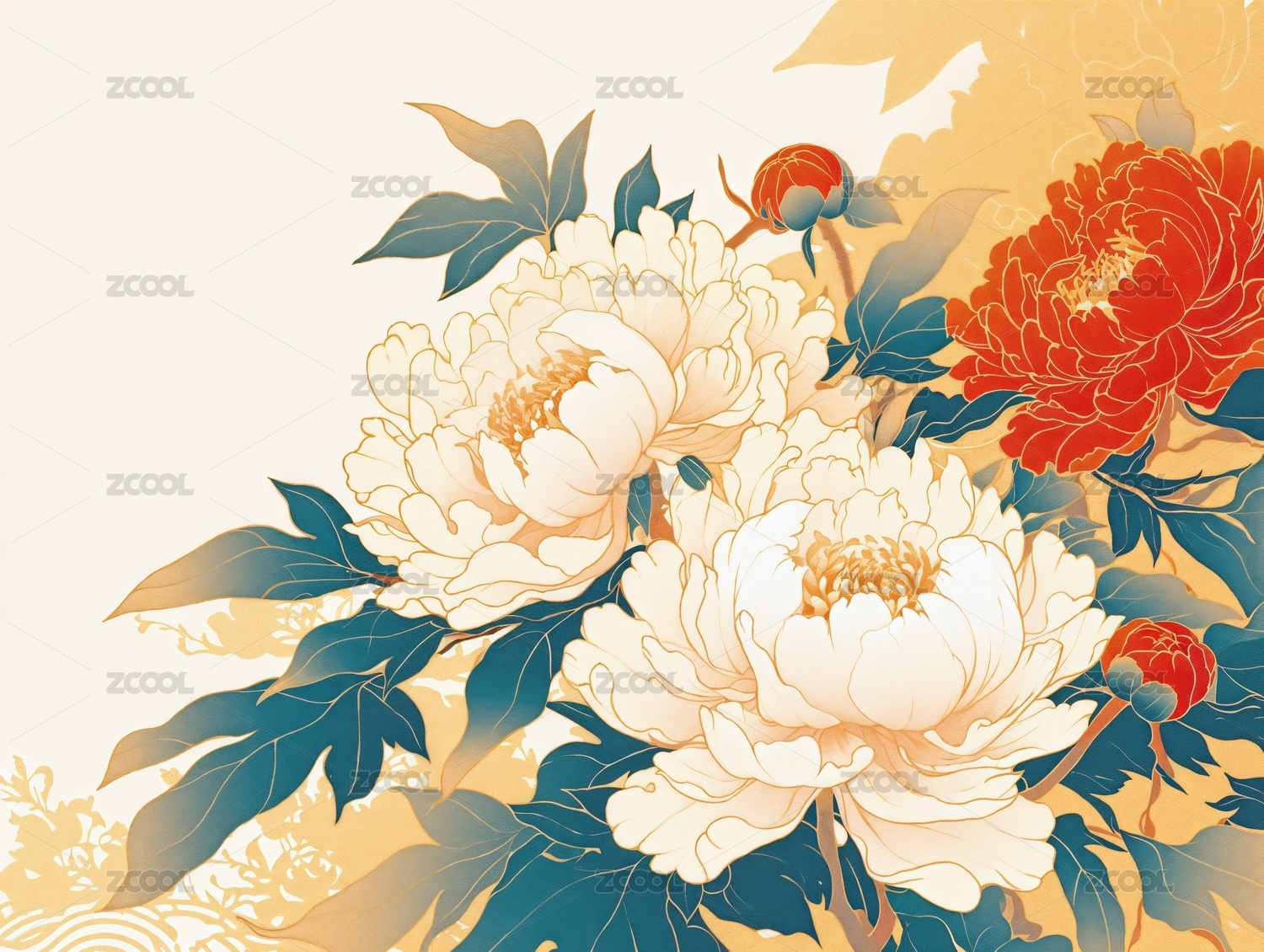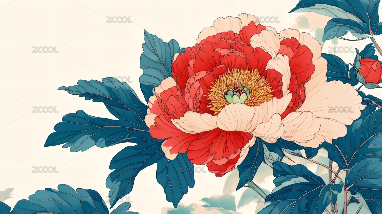 浮世绘植物花卉一朵大花红白相间绿叶留白