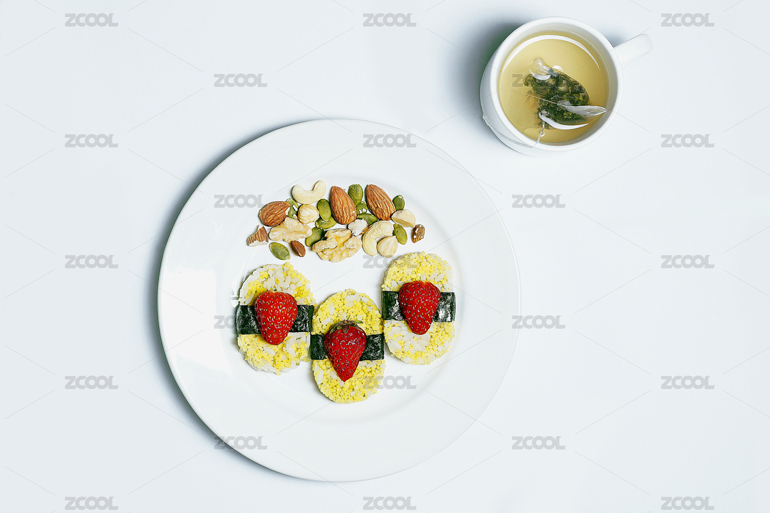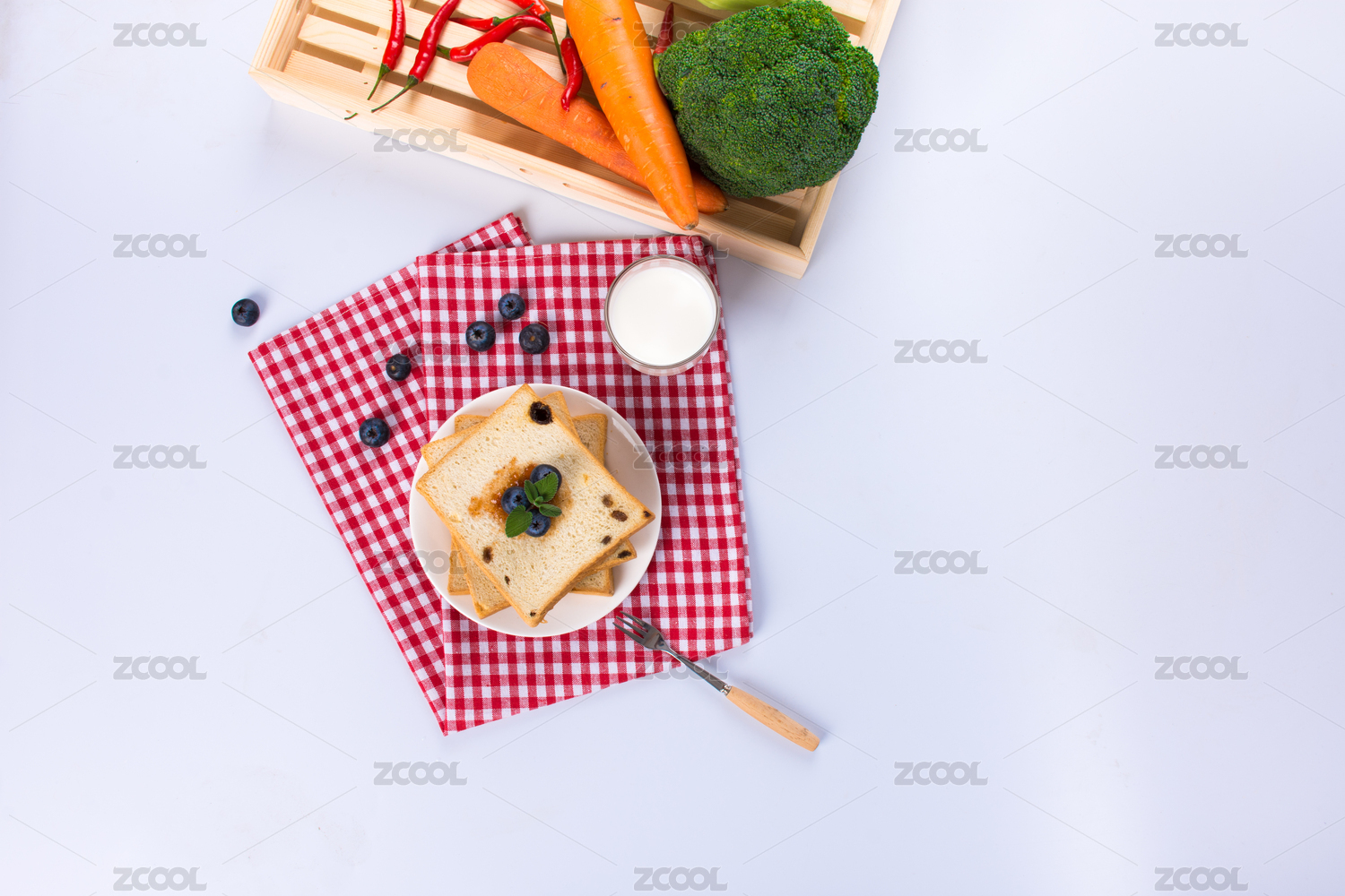 棕色木纹桌上放着一盘面包鸡蛋早餐