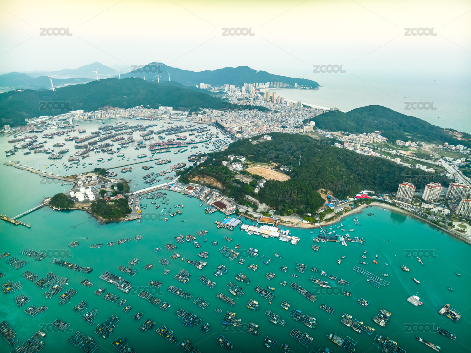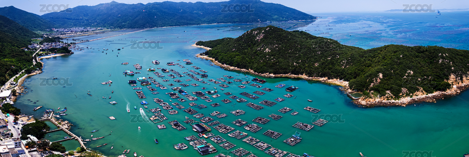 福建福州渔村鱼排与渔船航拍蓝天白云大海山