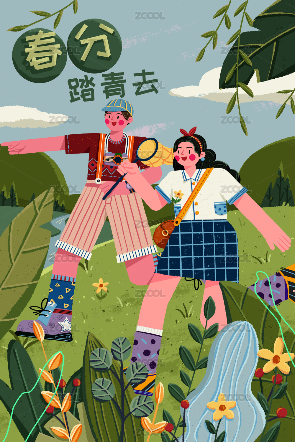 插画女孩春分节气凉爽花草跑道蓝天锻炼公园