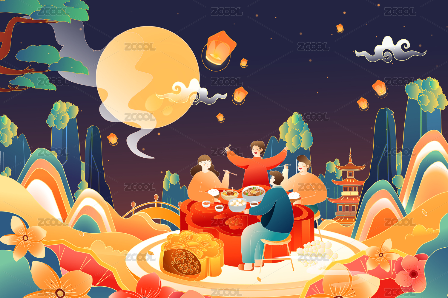 中秋节家人团圆矢量插画