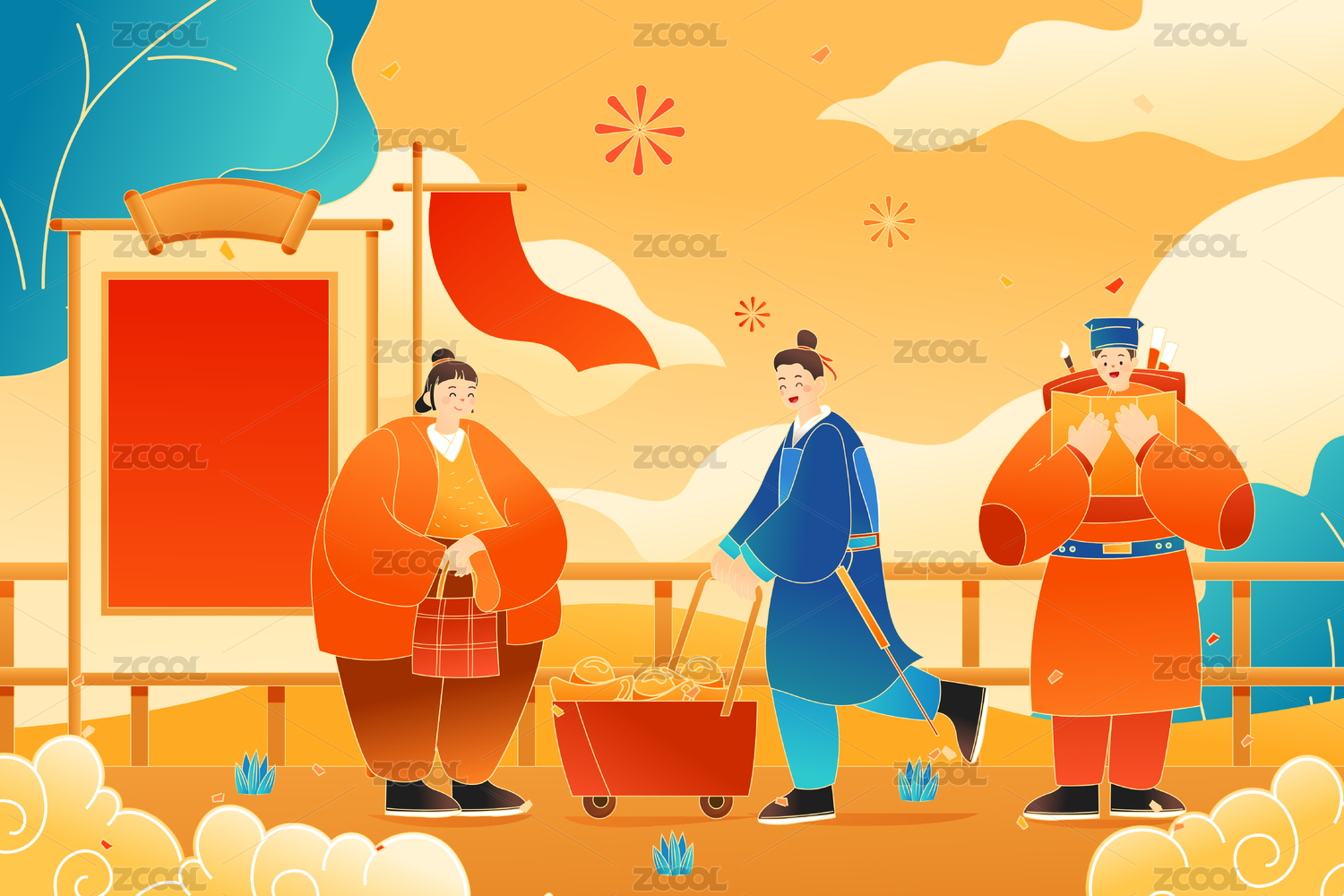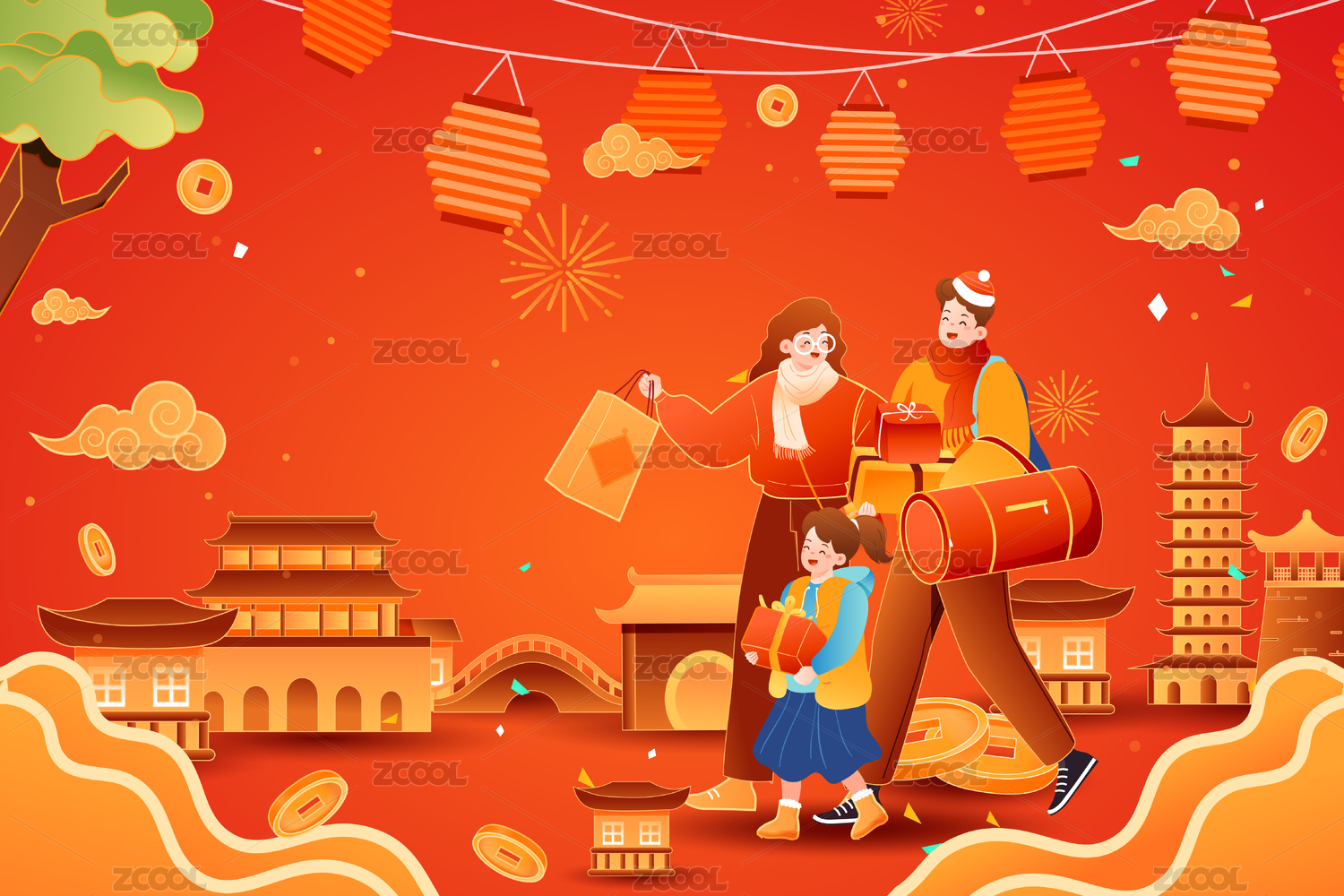 年货节春节喜庆风景矢量插画