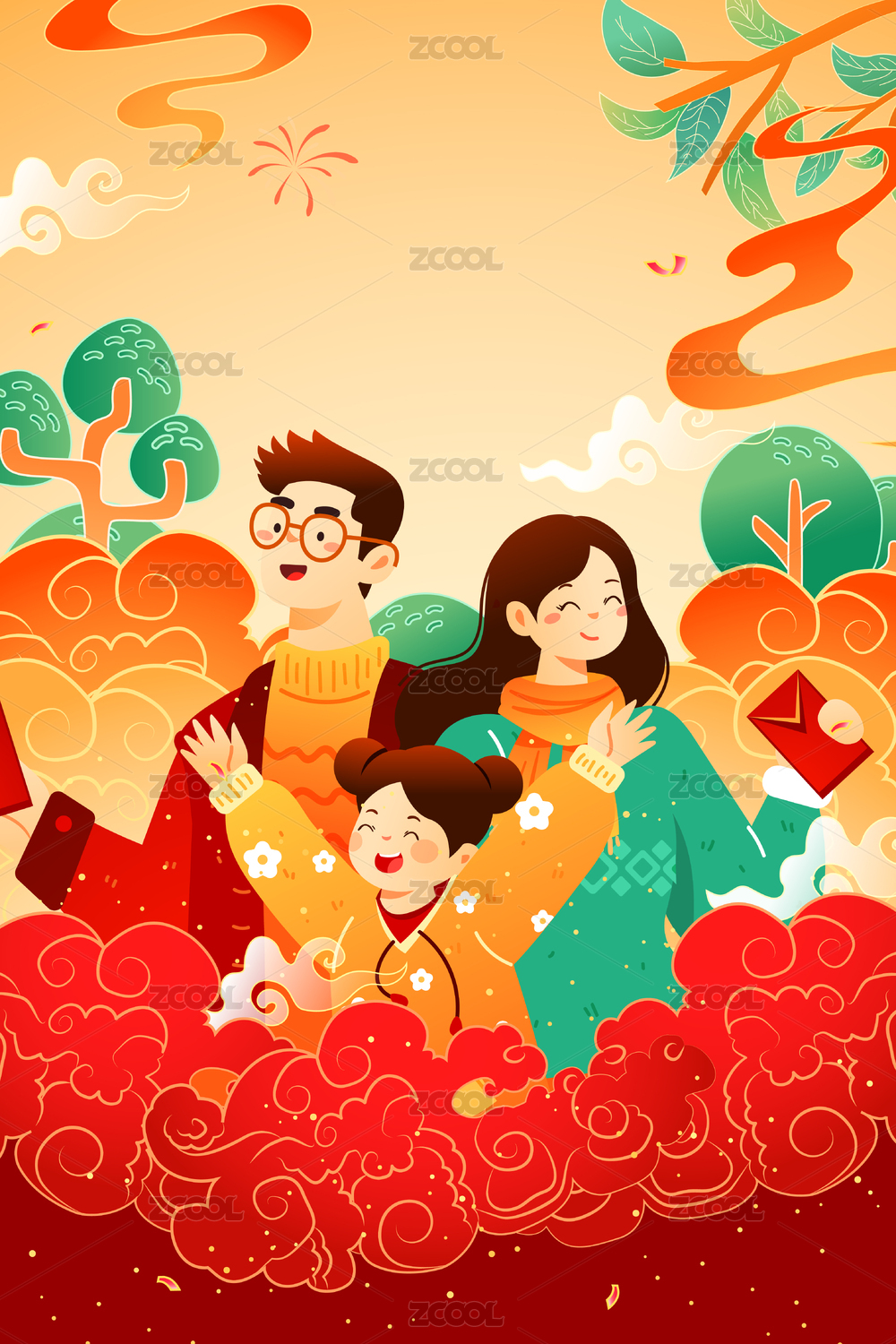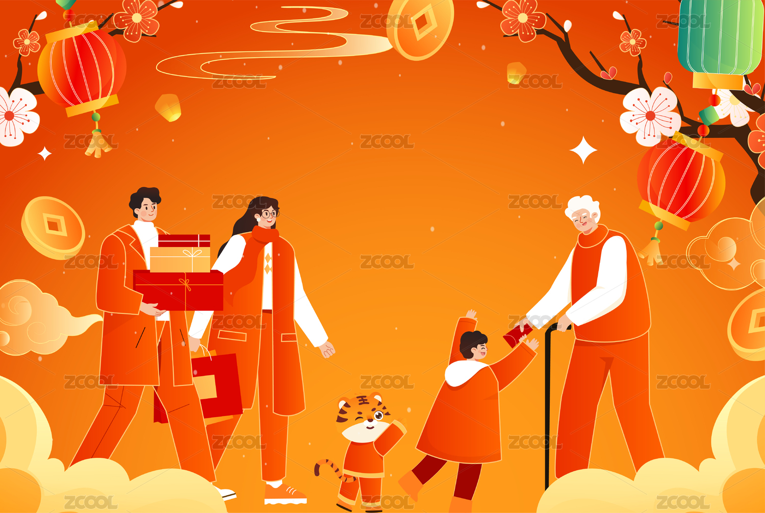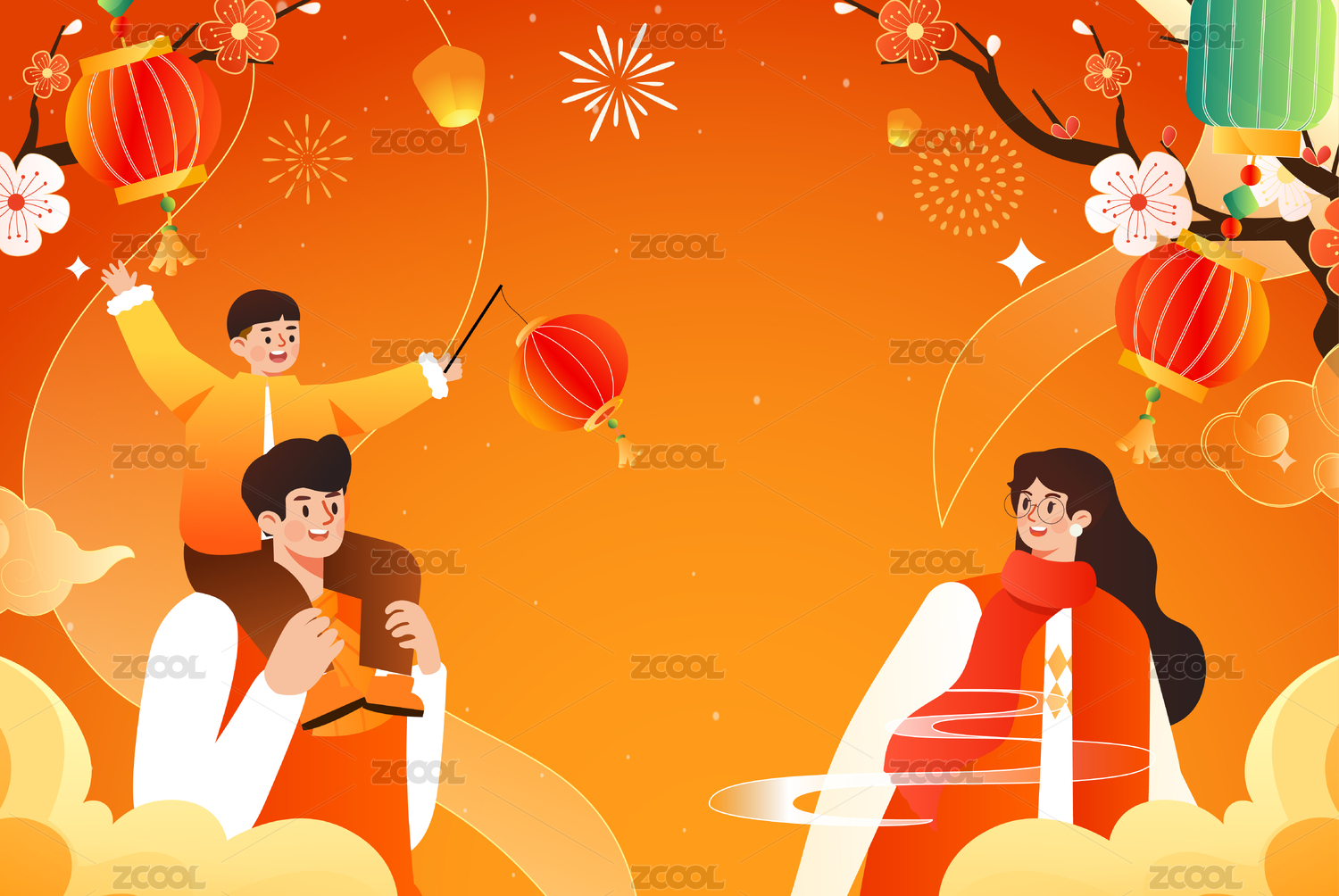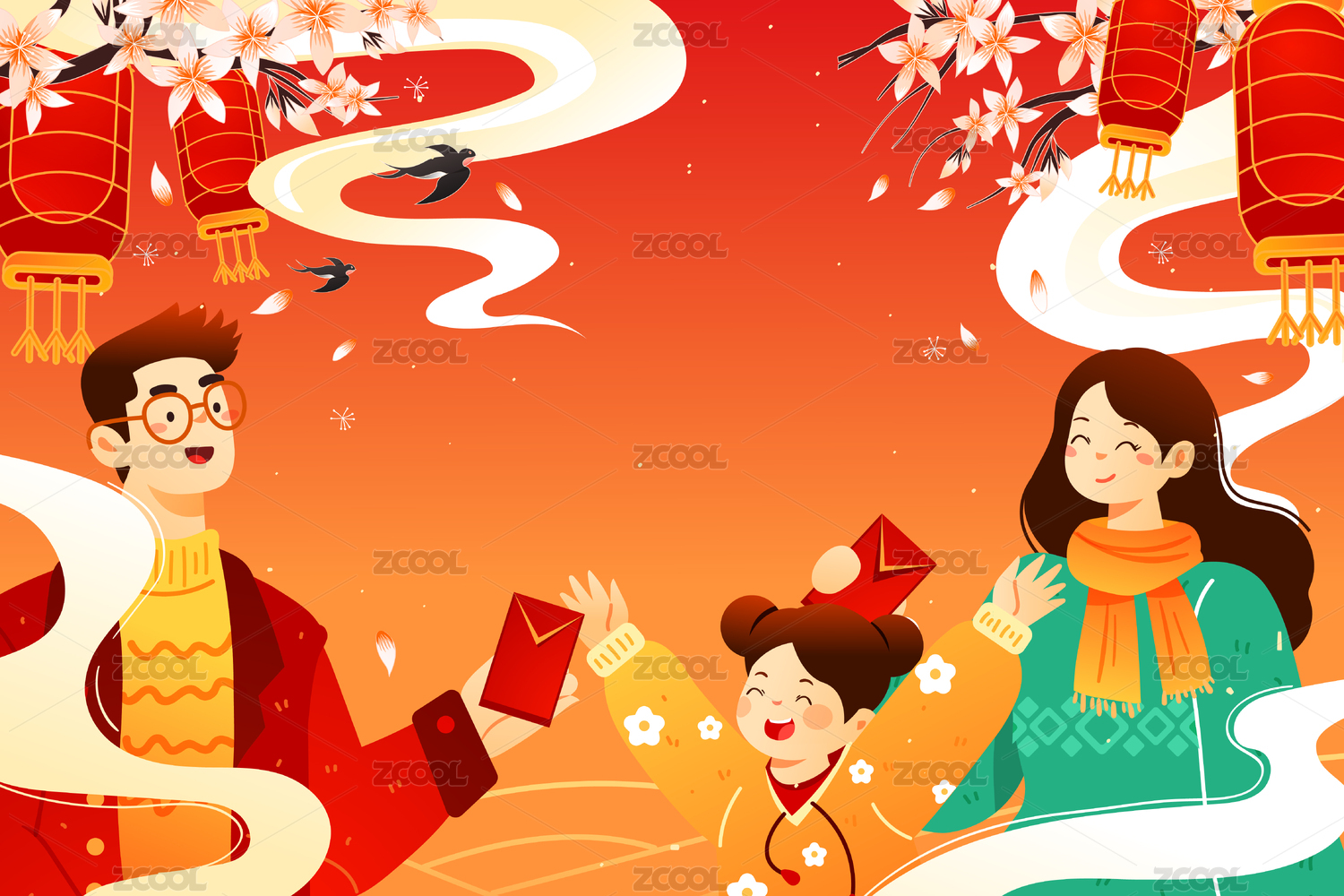新春龙年过年人物传统喜庆矢量插画素材背景