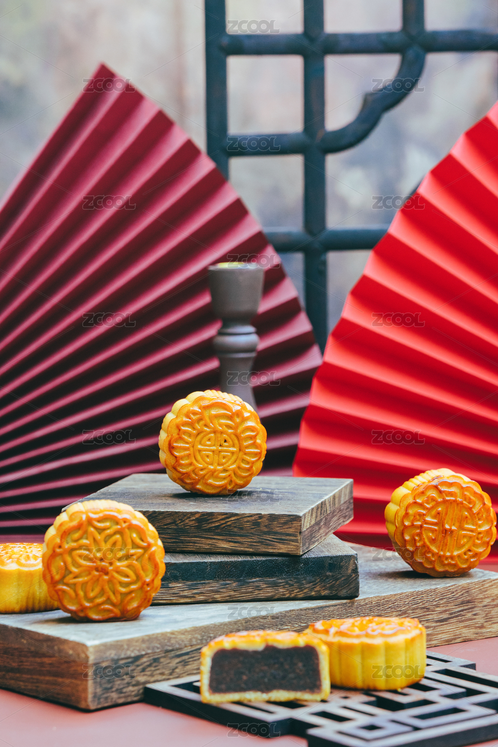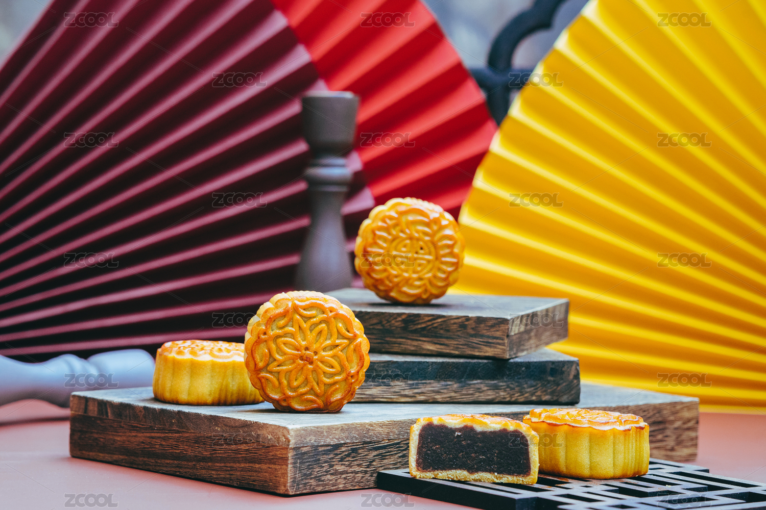 金黄色的可口豆沙馅月饼摆放在木桌上
