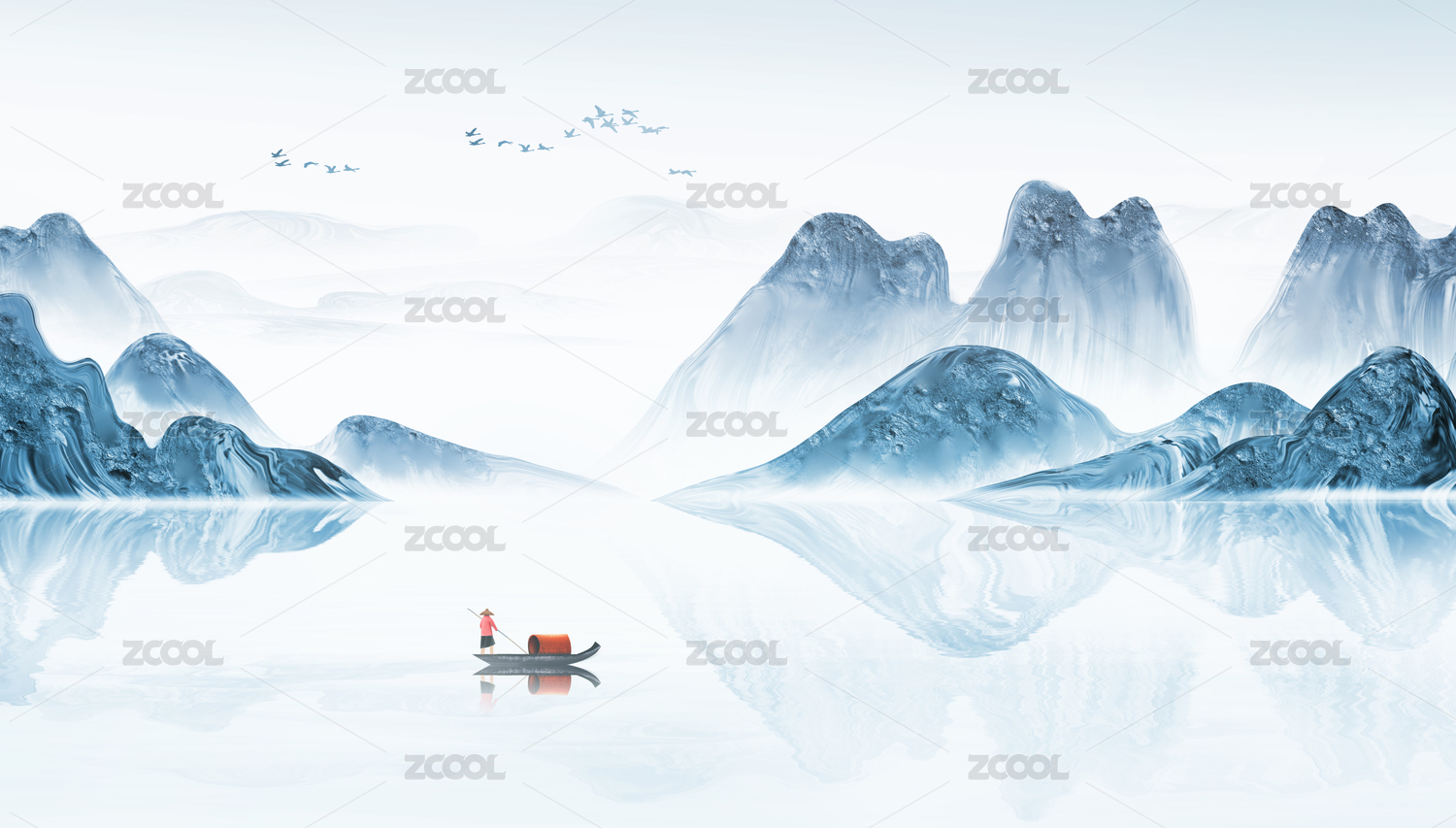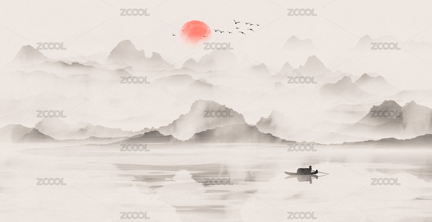 古人泛舟 水墨国风古典山水主题背景