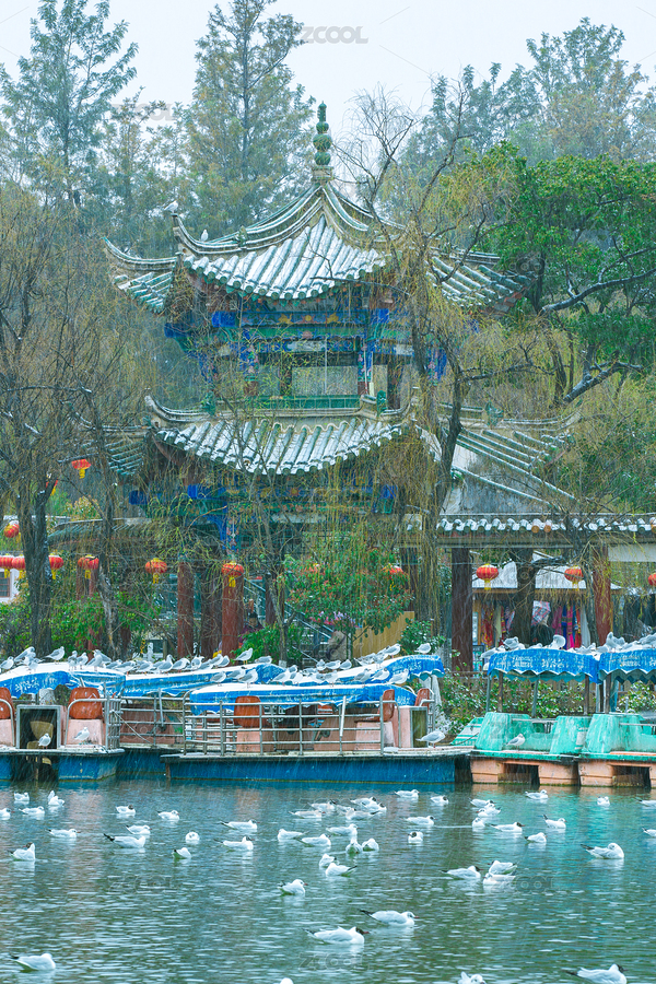 中国云南昆明翠湖公园下雪后的古典建筑风光