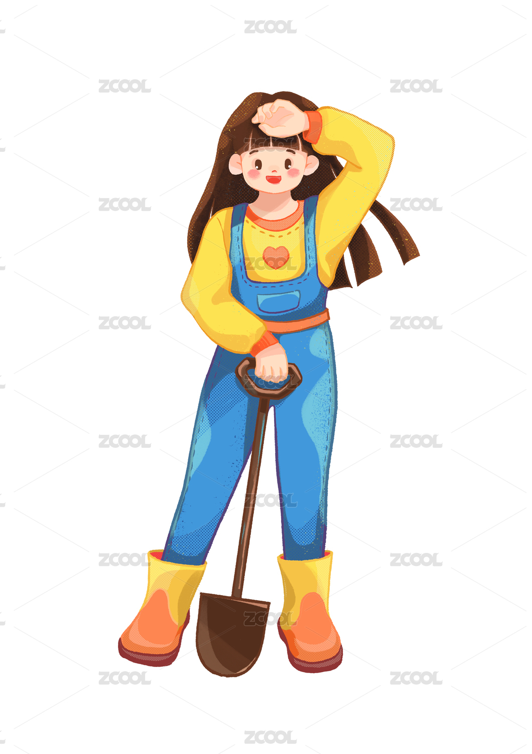 小女孩穿着工作服手持铲子