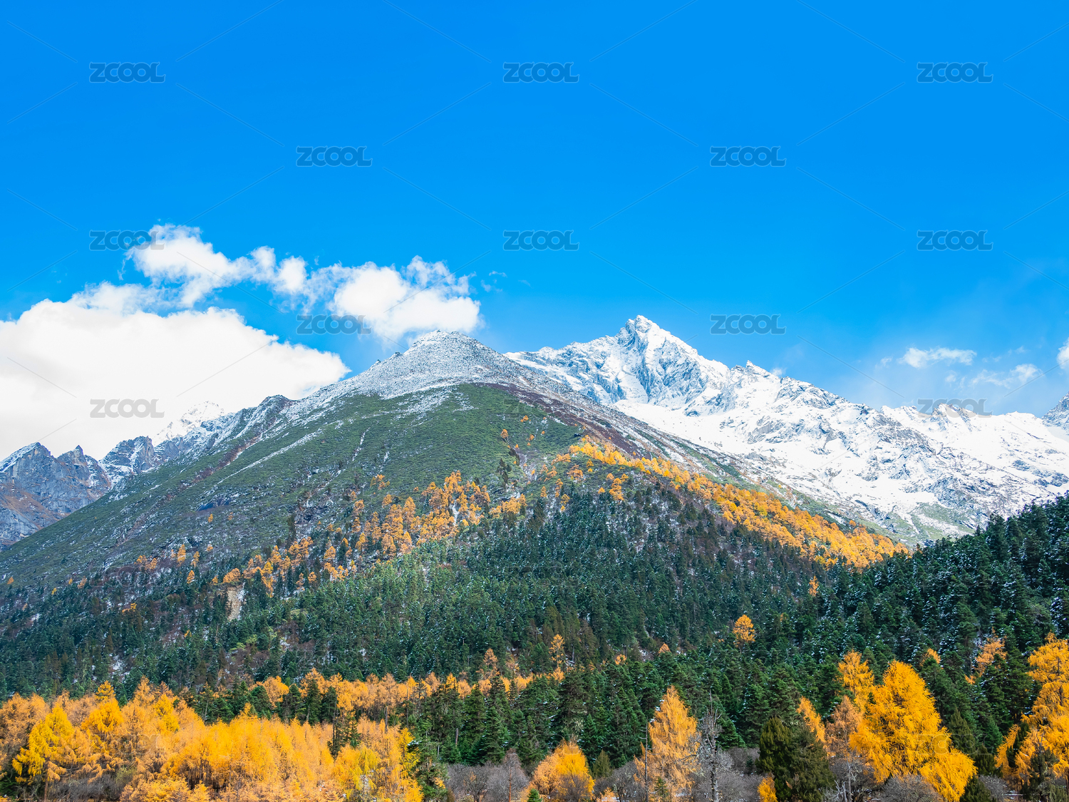 云南德钦白马雪山蓝天白云衬托雪山森林