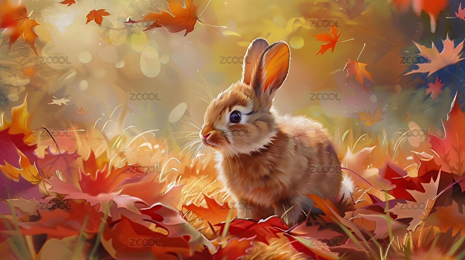 兔子,森林,秋天,树叶,动物,可爱,卡通,绘画,插画,童趣