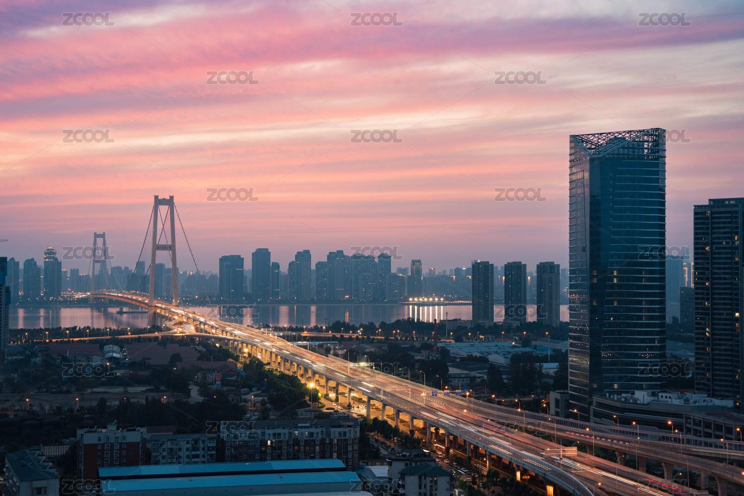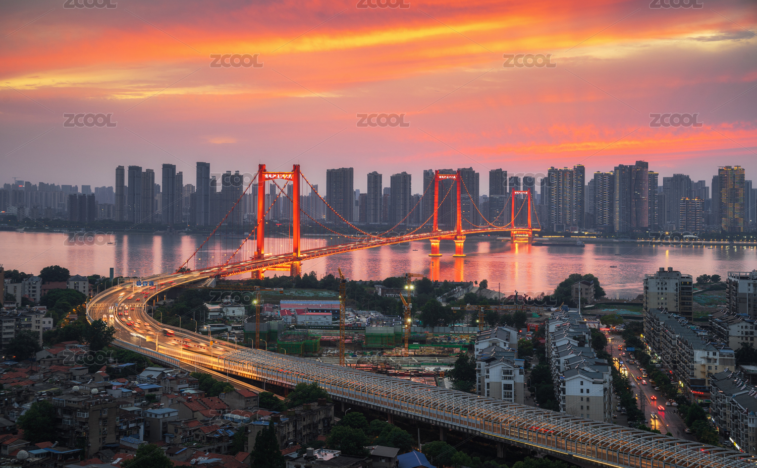 中国湖北省武汉市鹦鹉洲长江大桥夜景晚霞