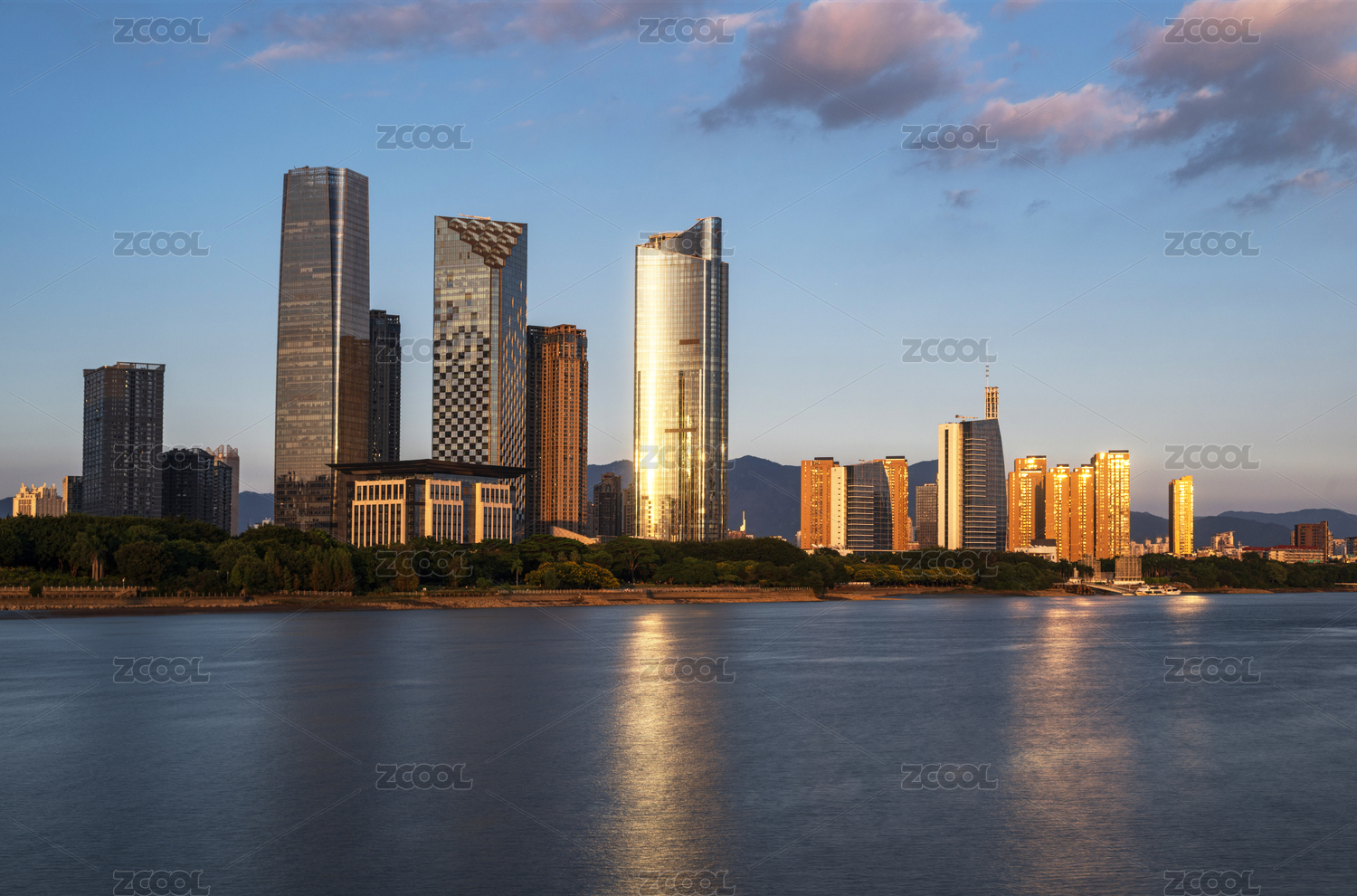 福建省福州市闽江沿岸CBD天际线的黄昏