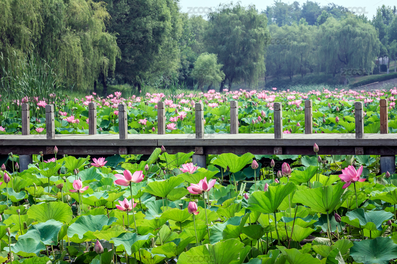 夏天水塘里石板桥两侧盛开着的一大片荷花