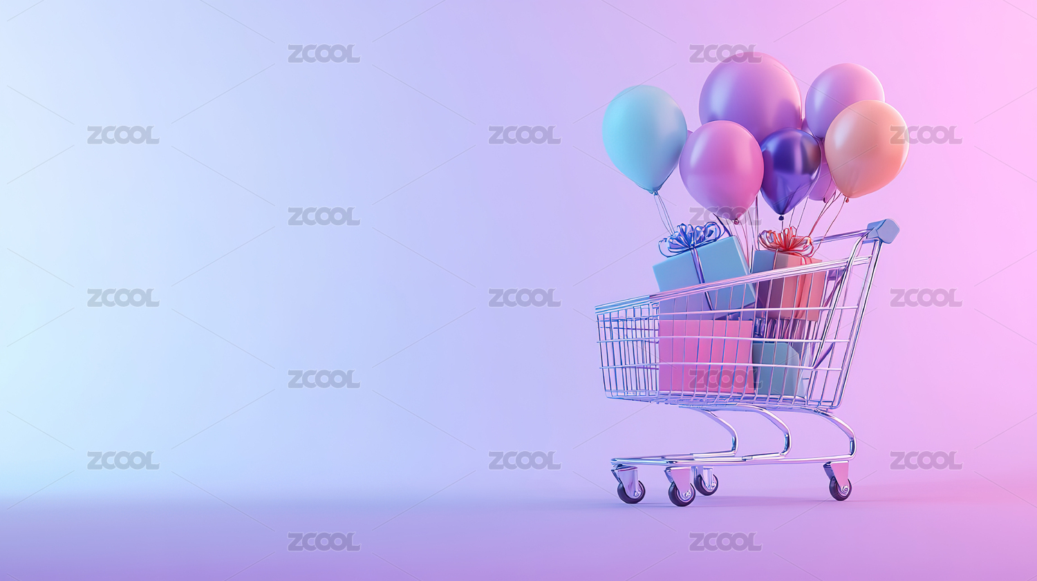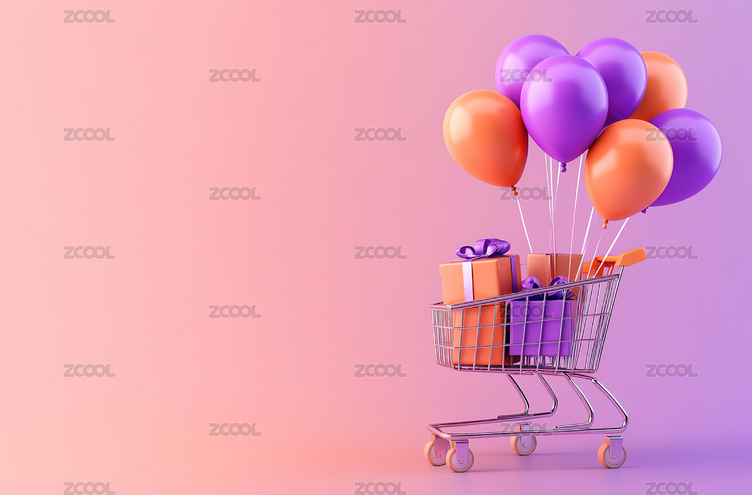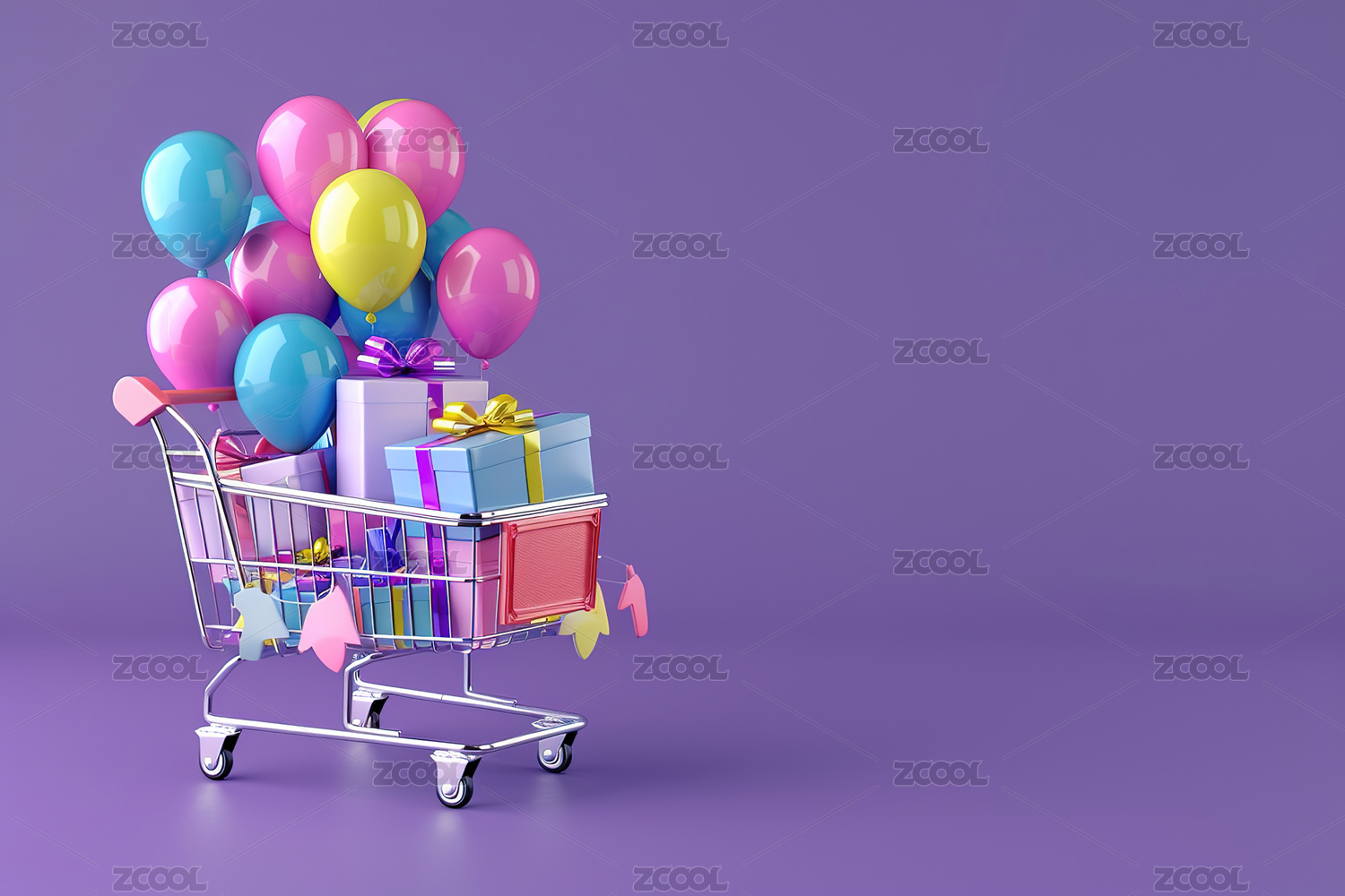 彩色背景下购物车中的气球和礼品盒特写镜头