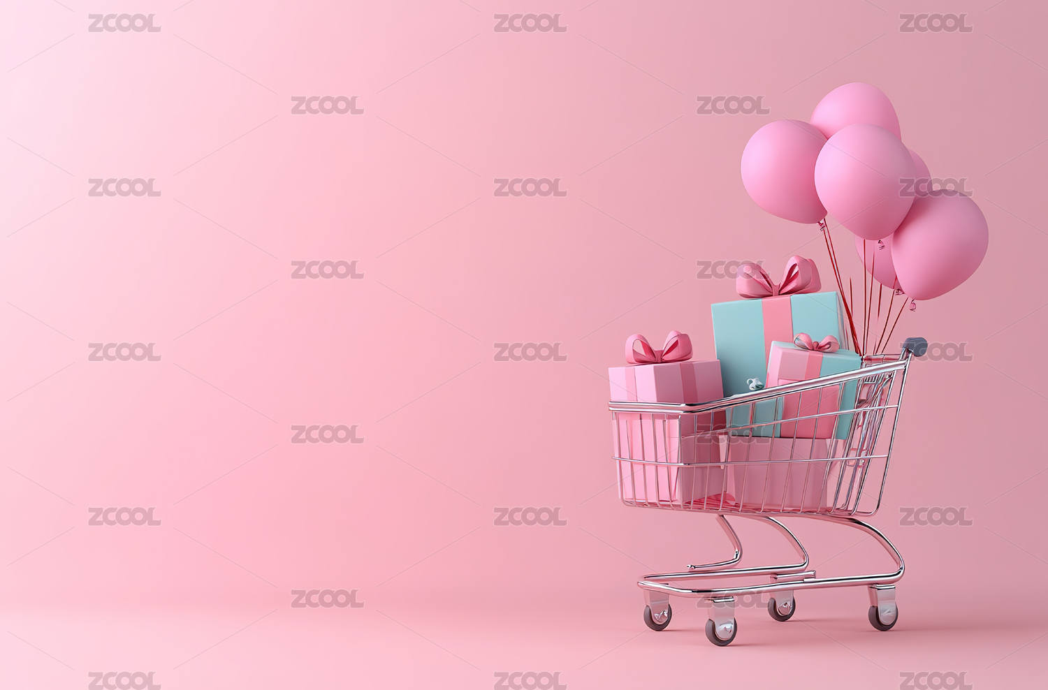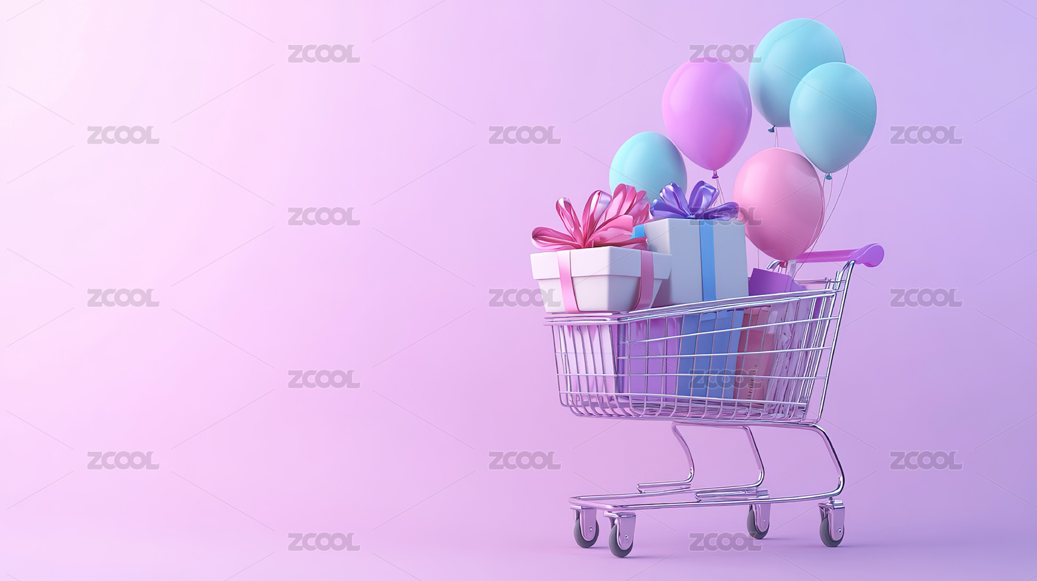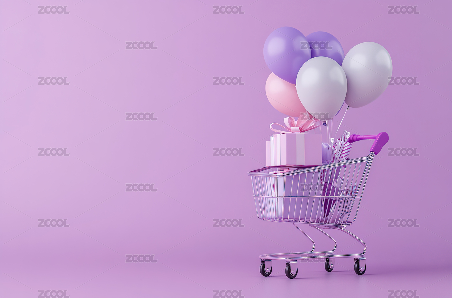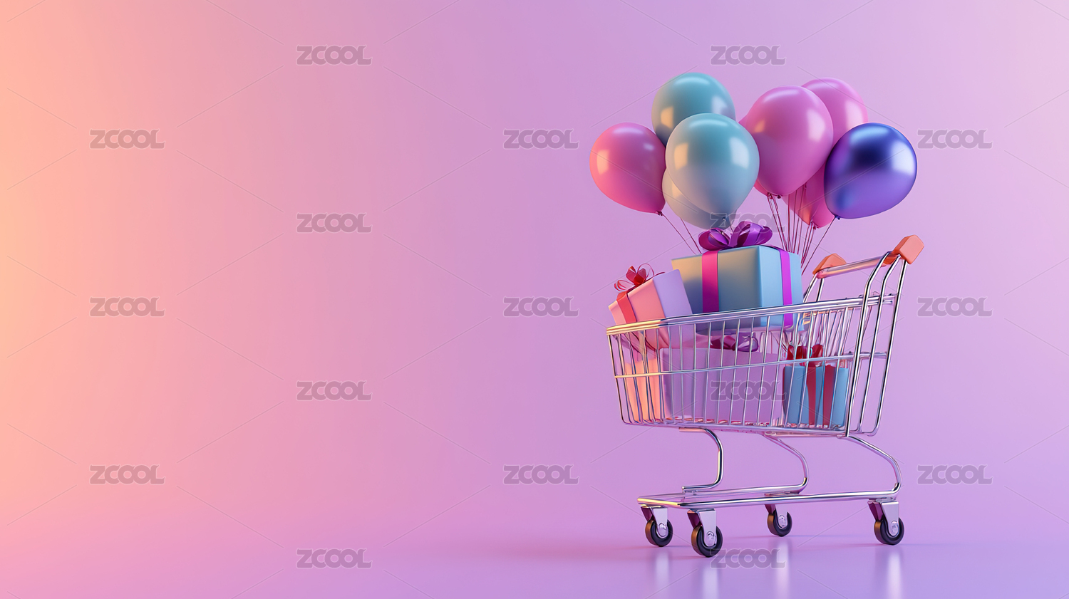 彩色背景下购物车中的气球和礼品盒特写镜头
