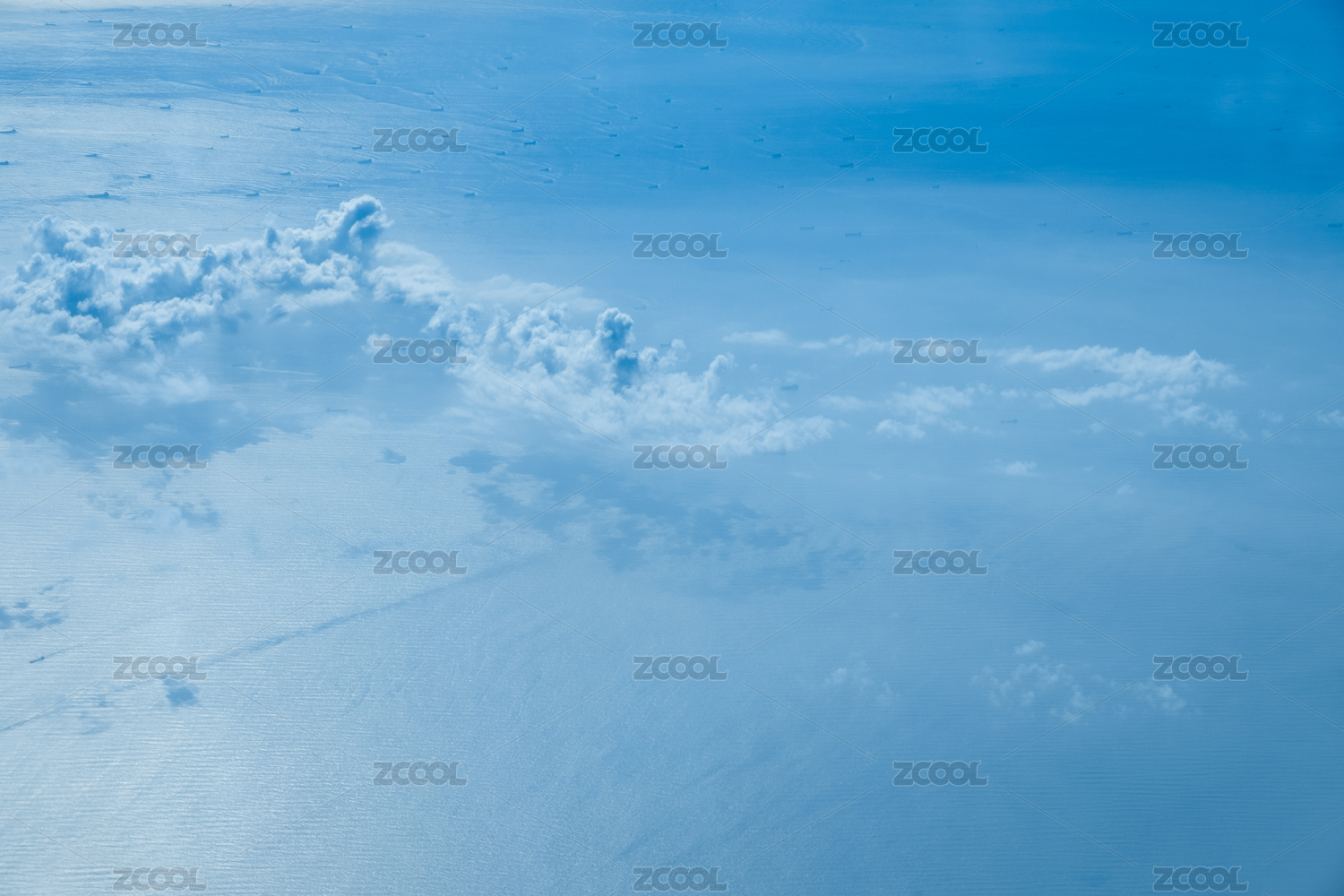 空中俯视海面波光粼粼和上方的云海