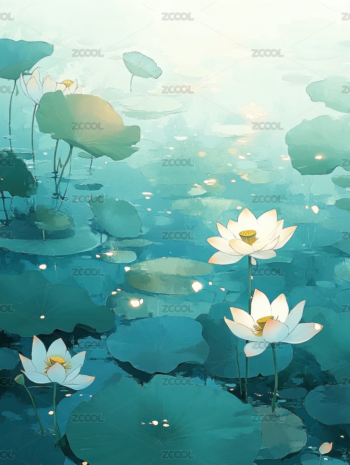 夏天清新的荷塘与荷花,日本浮世绘艺术