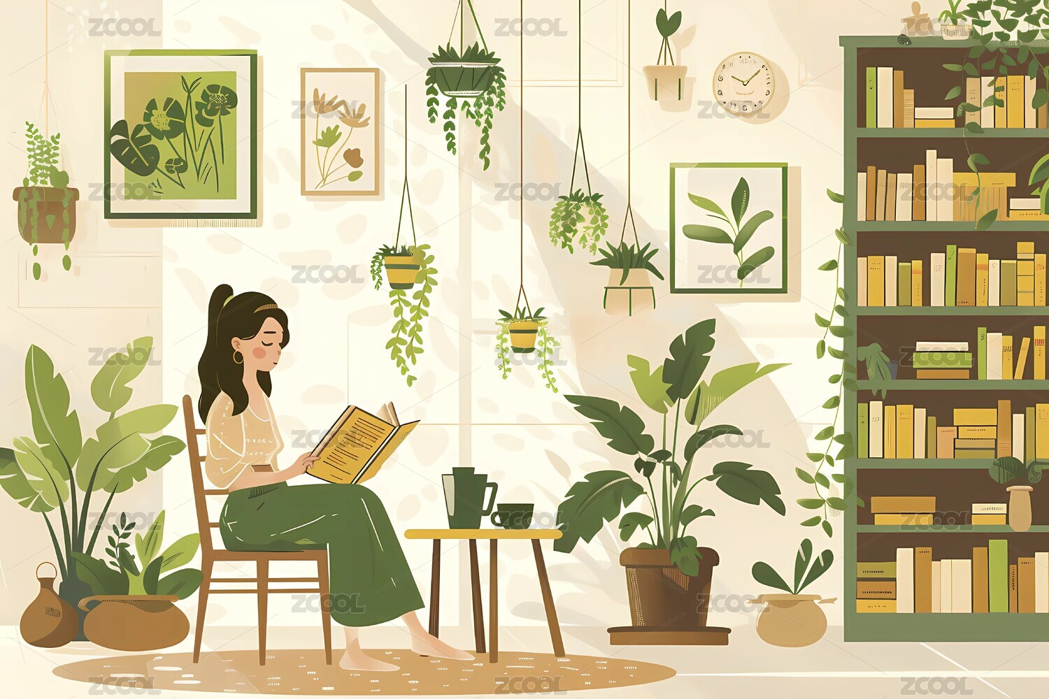 AIGC202402,扁平风,室内,秋天,女孩,绿植,挂画,闹钟,书架,办公桌