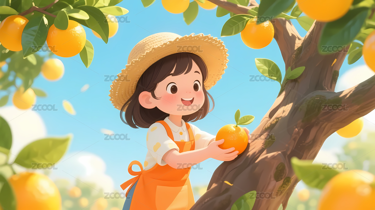 AIGC202402,扁平风,户外,风景,秋天,苹果树,果树,采摘,劳作,劳动节