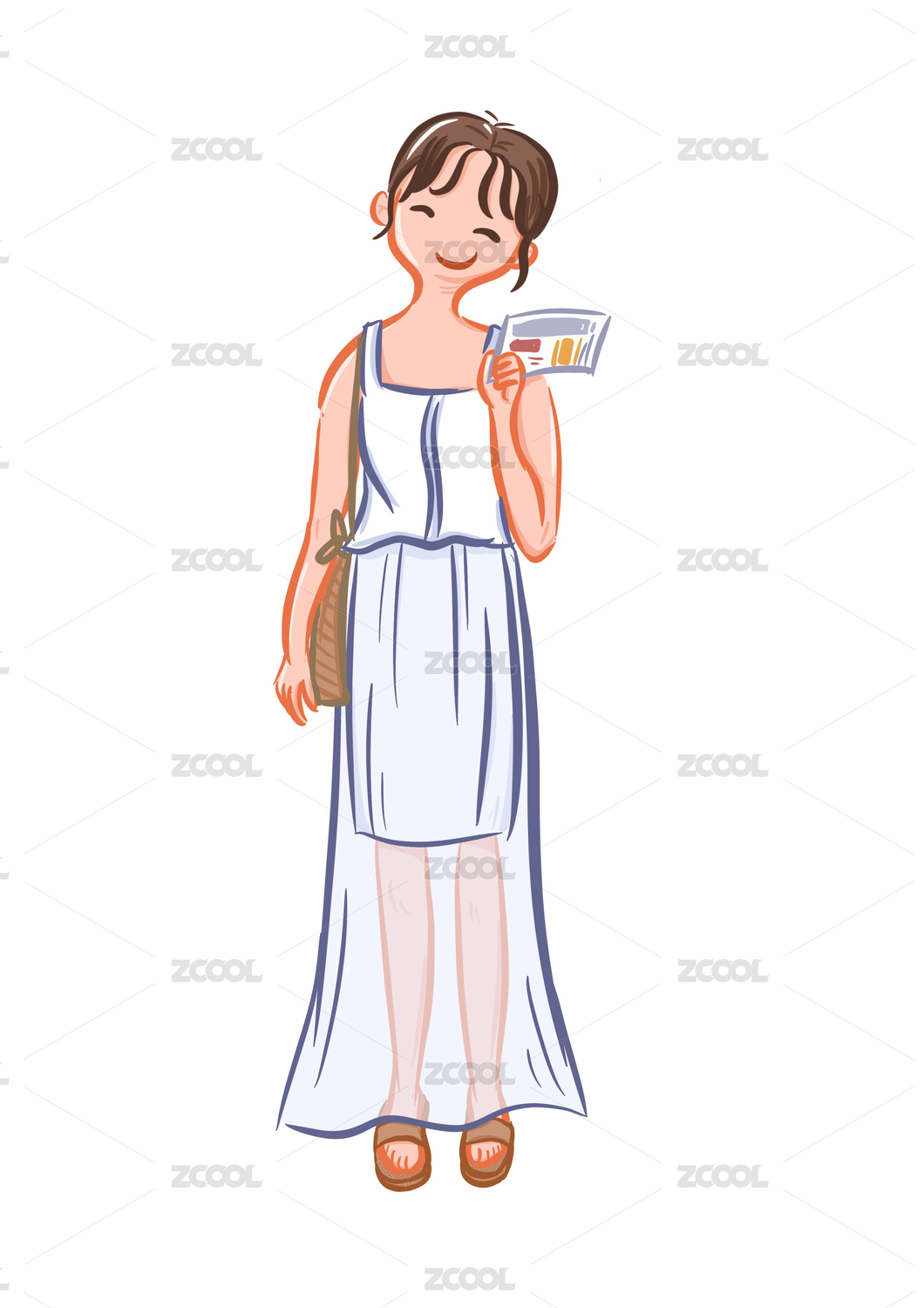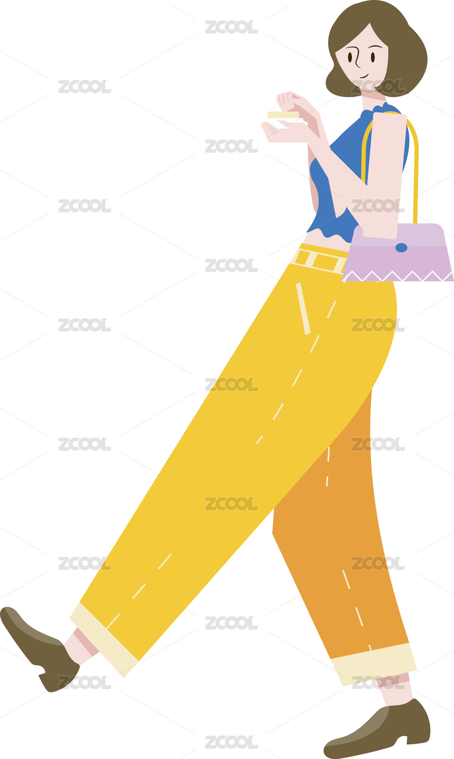 拿咖啡背斜挎包长卷发的时尚女孩插画