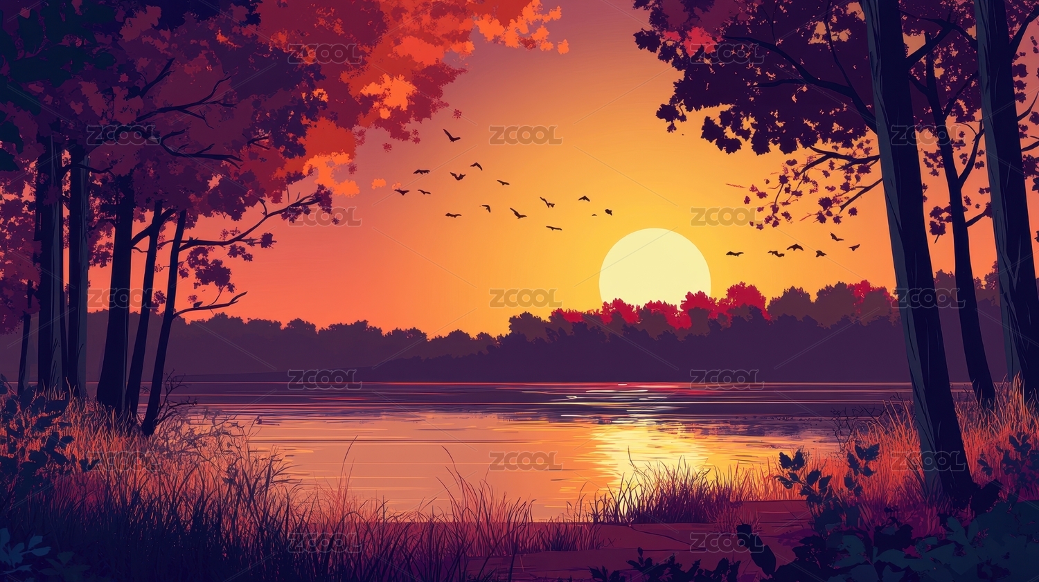 夕阳西下湖边树木的剪影