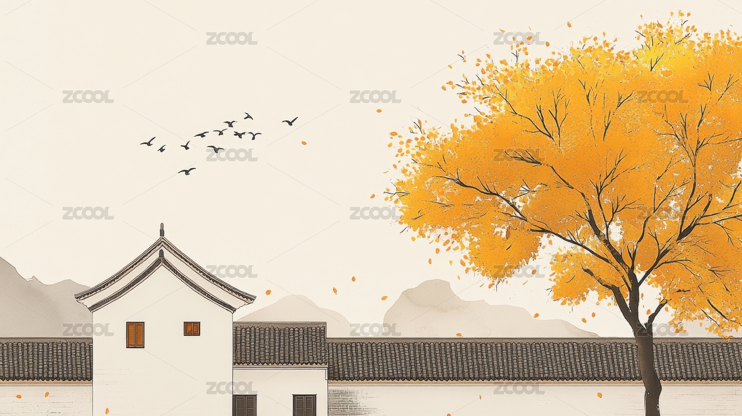 中国风江南银杏树古建筑山水画