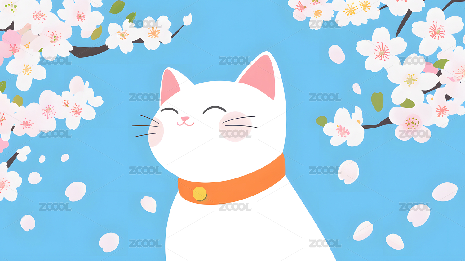 春天,樱花,樱花树,猫,小猫,白猫,宠物,卡通,插画,可爱