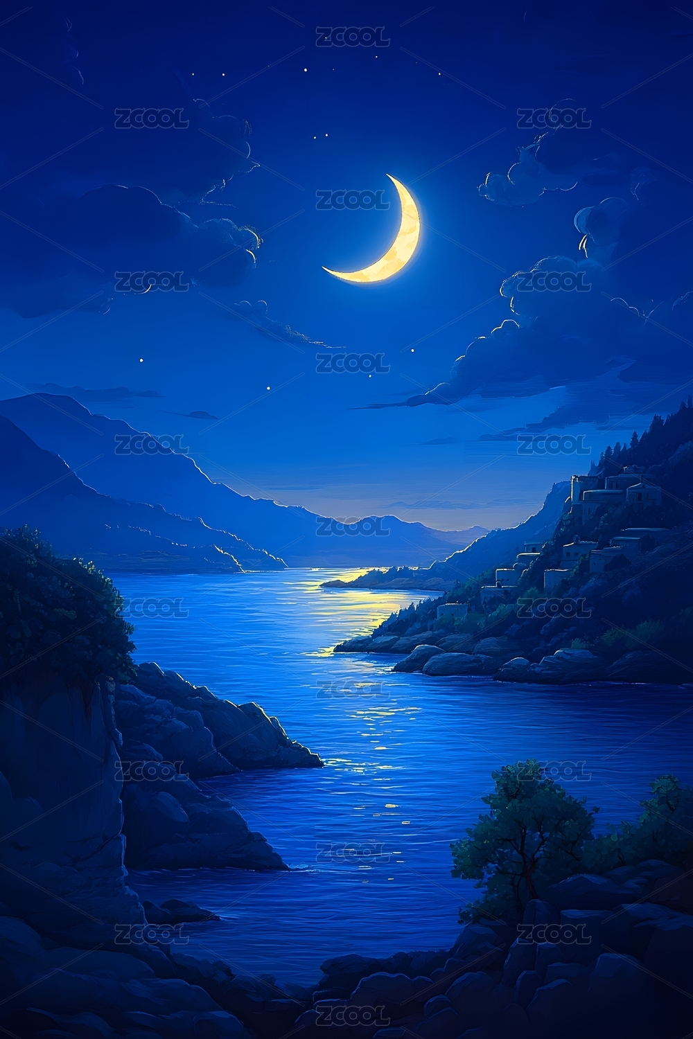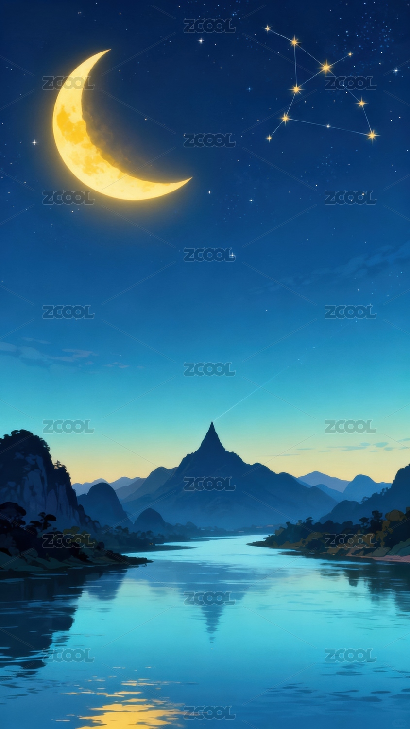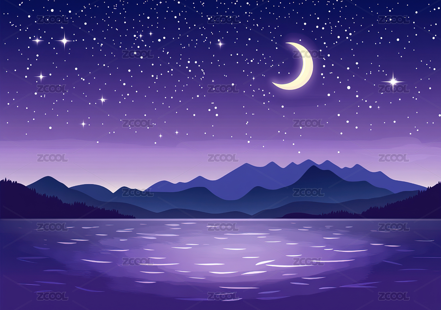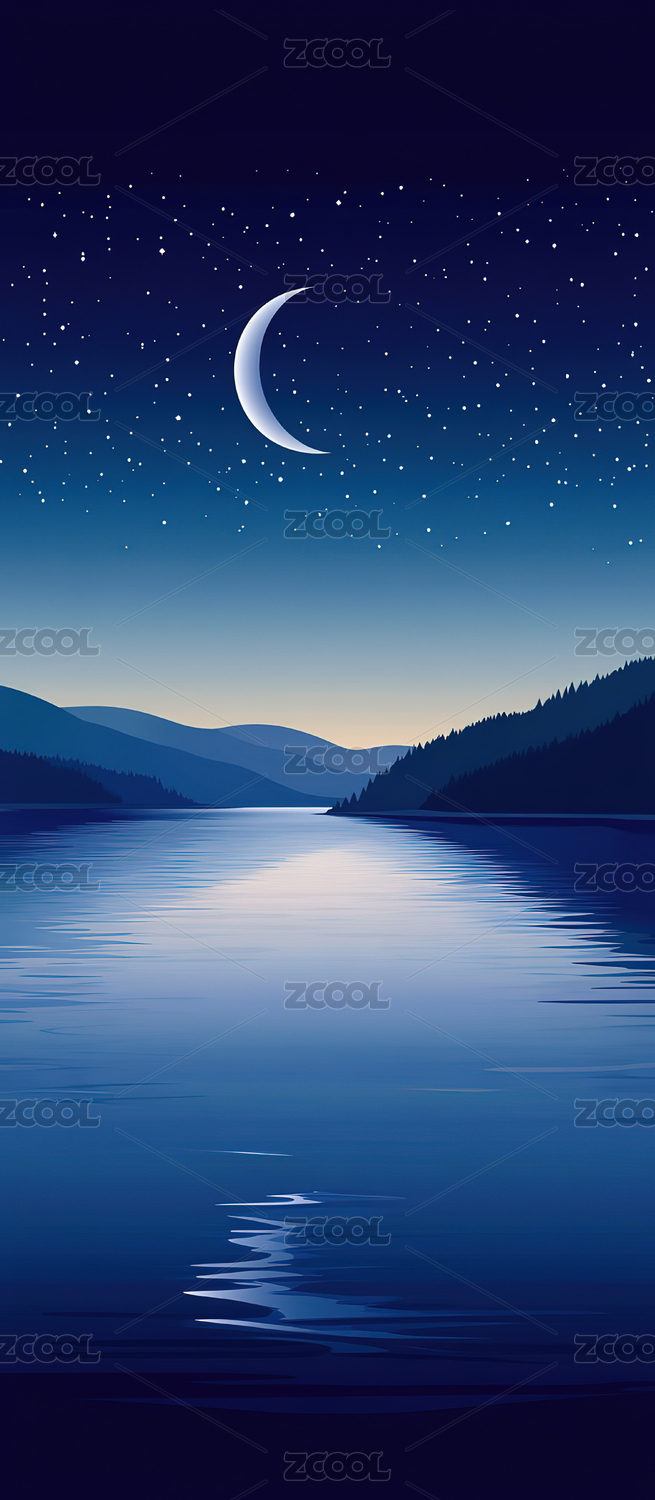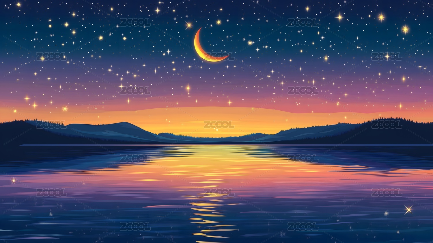 自然,波光粼粼,宁静,神秘,星空,夜空,湖面,弯月,夜晚,月光浴