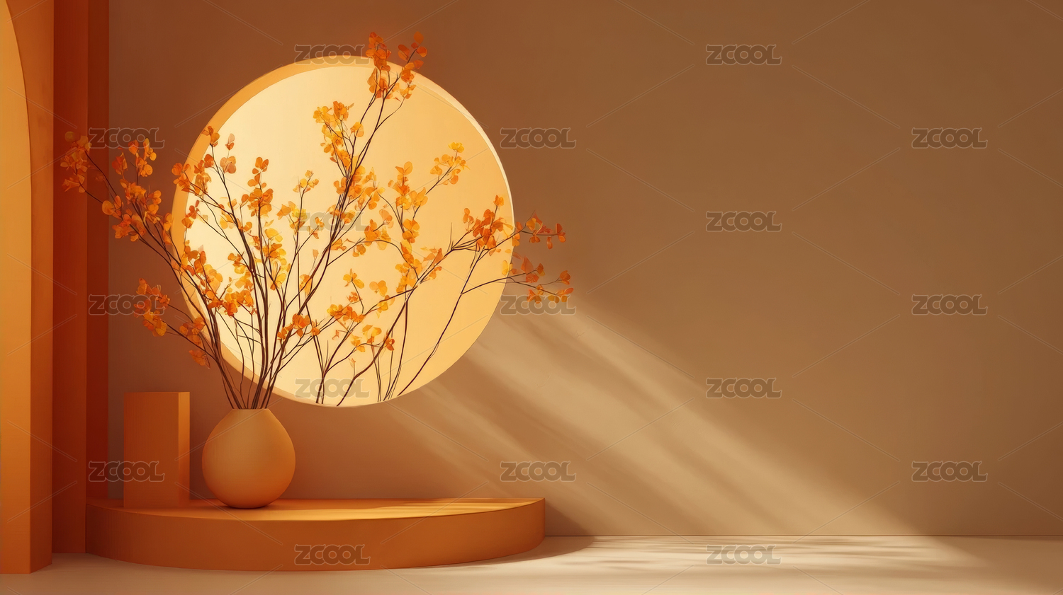 橙花瓶与圆窗室内背景
