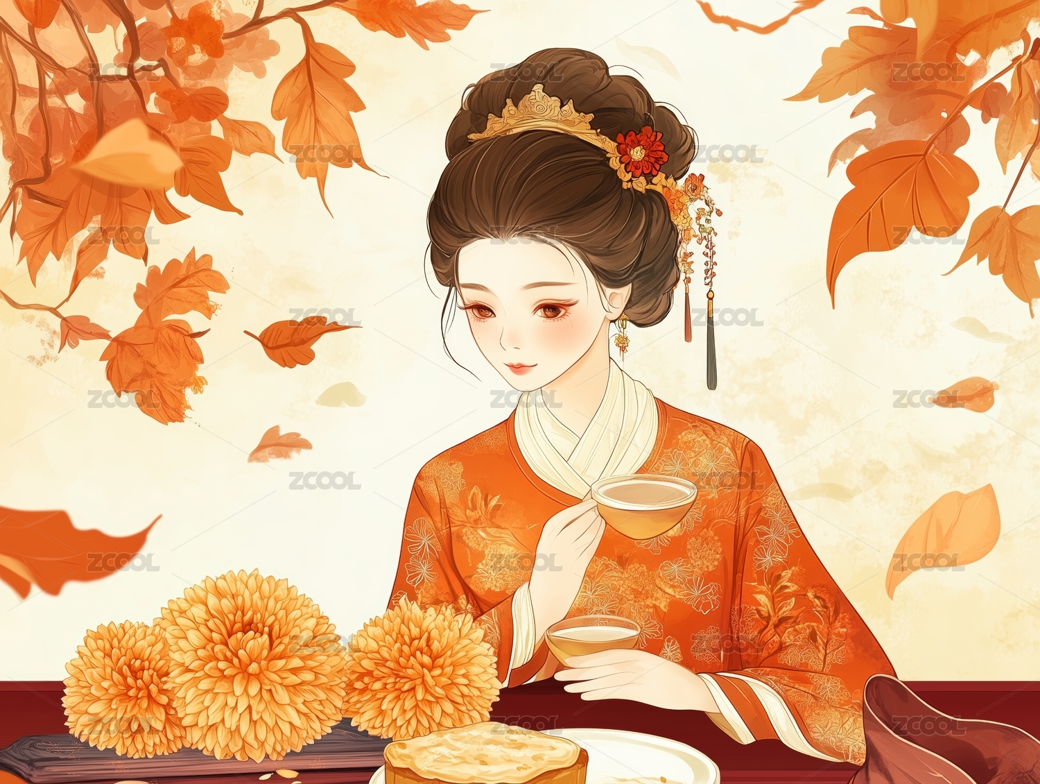 中秋节,桂花树,可爱,古装,女孩,月饼,黄色,卡通,落叶,秋天