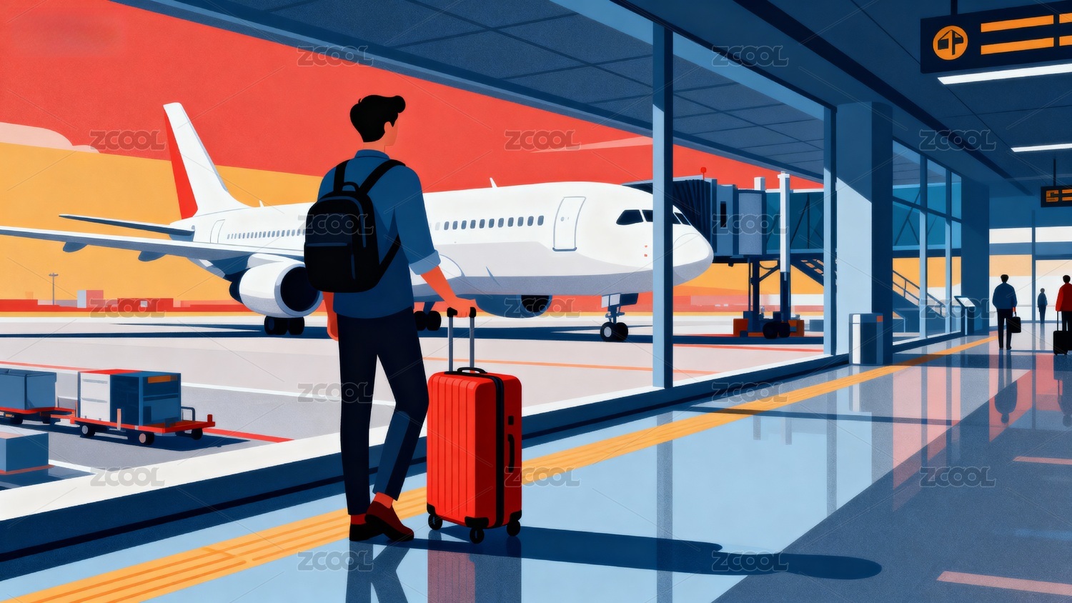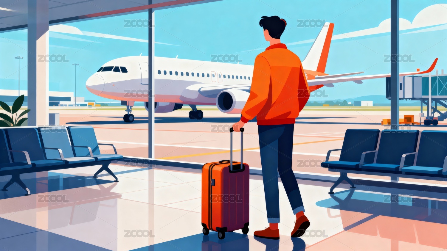 机场,候机厅,女性,橙色T恤,牛仔短裙,行李箱,等待,旅行,窗外,飞机
