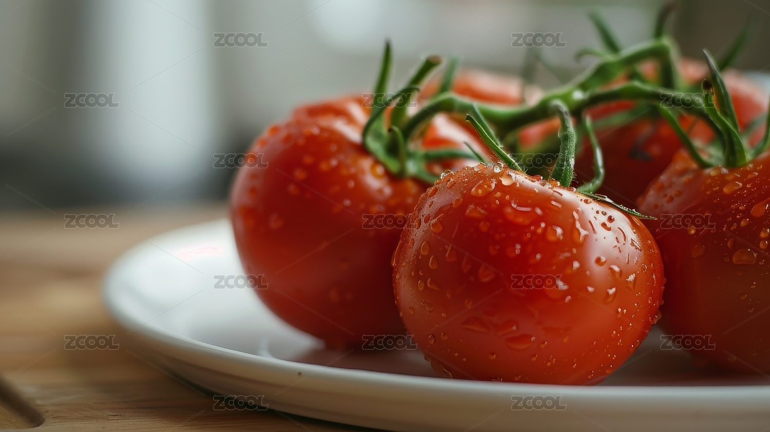 红色新鲜的小樱桃番茄放在白色的盘子里,蓝色的桌布以及花瓶碗的背景
