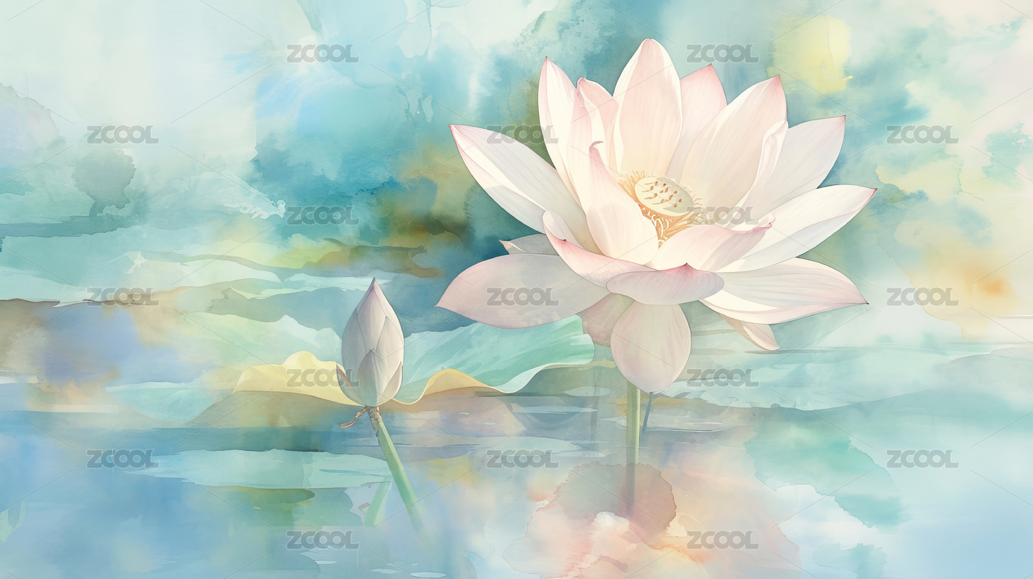 中国风荷花荷叶淡彩水墨插画壁纸背景