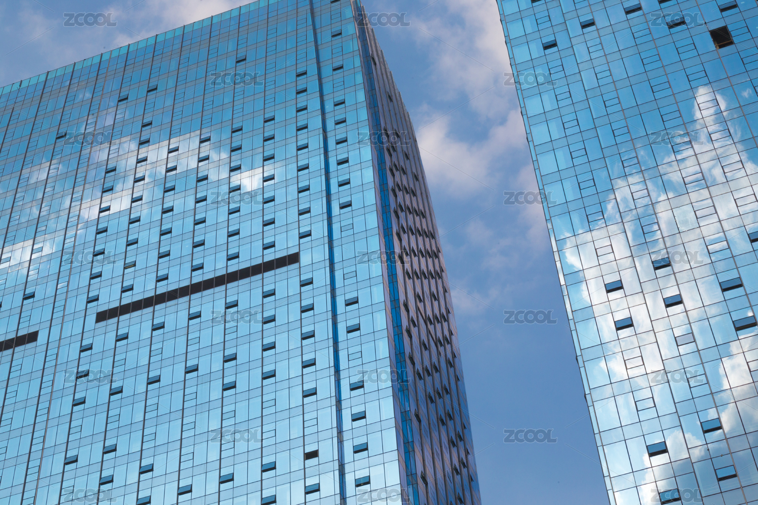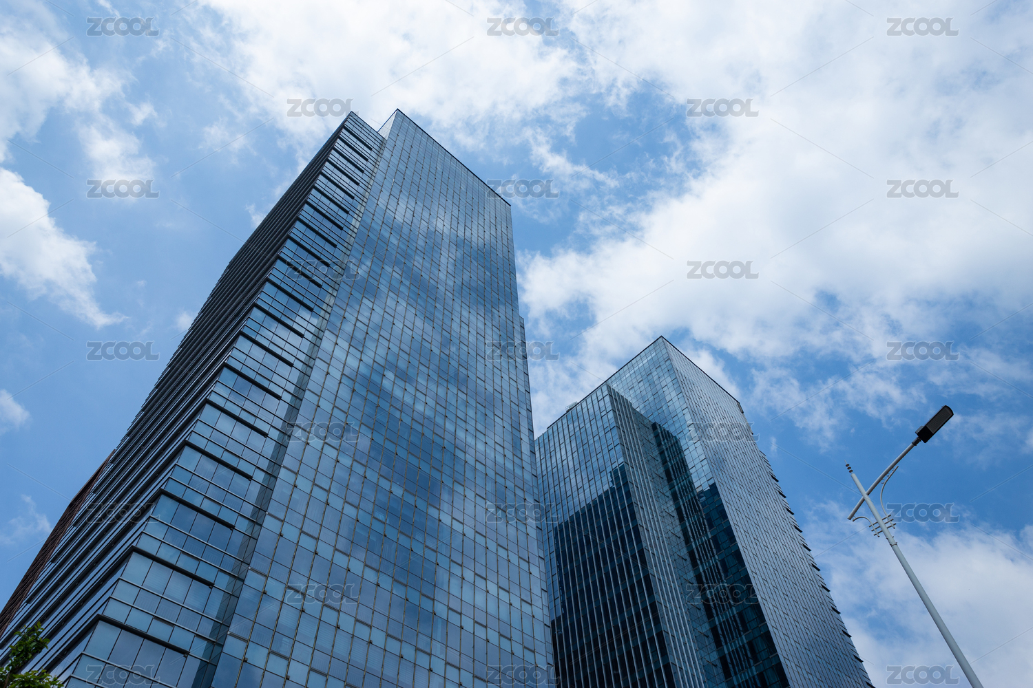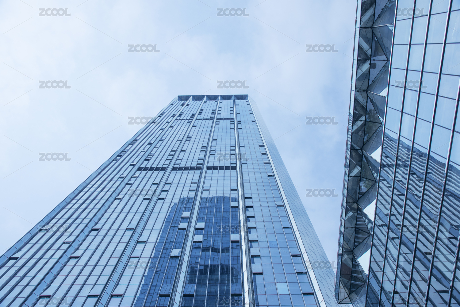 仰拍城市玻璃建筑幕墙产生透视汇聚线条